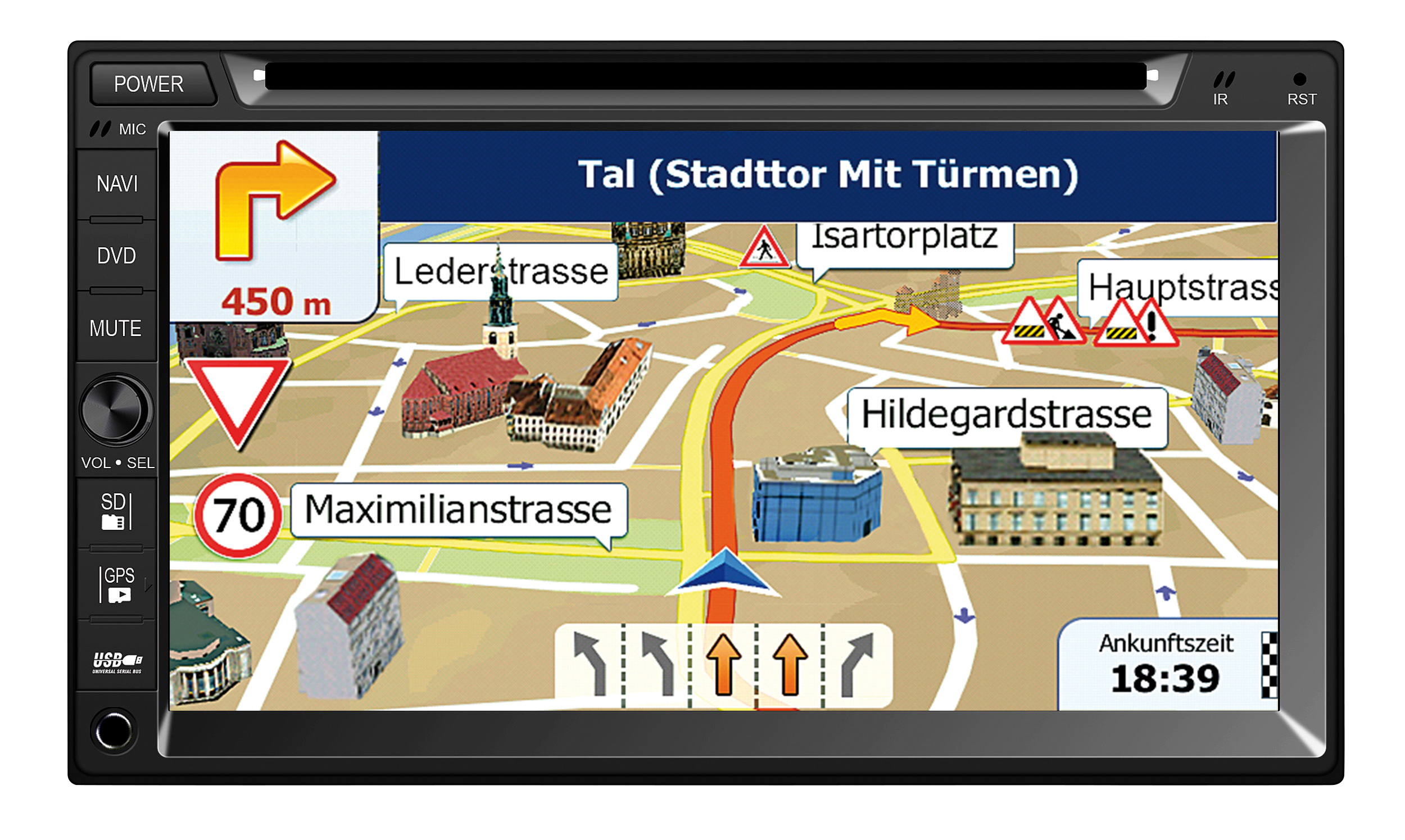 Mit Kartenmaterial auf microSD-Karte wird das Autoradio zum echten Navi. Vier Kartenversionen stehen zur Verfügung, alle mit topaktuellem 3D-Kartenmaterial dank Up-to-Date-Garantie!