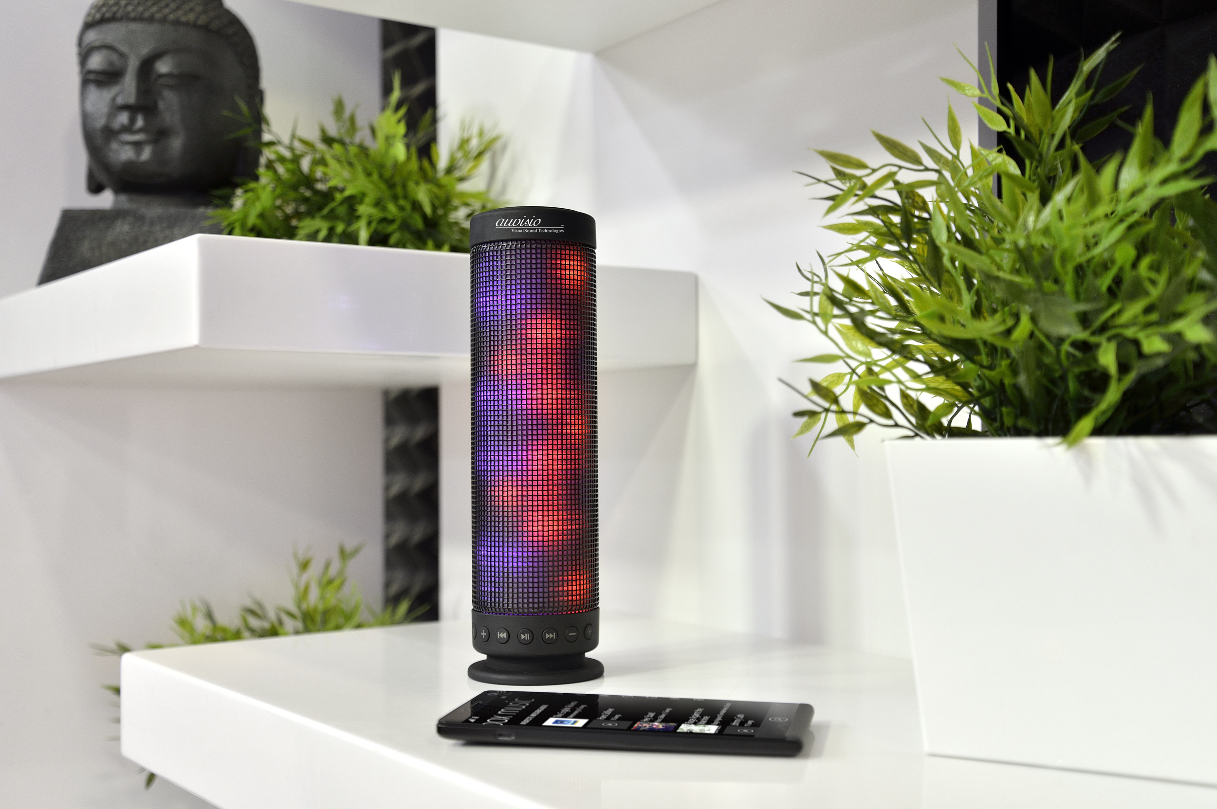 (lifepr) (Buggingen, 08.06.2015) Stimmungskanone im robusten Gehäuse: Der auvisio Lautsprecher pulsiert in sämtlichen Farben zum Rhythmus der Musik.