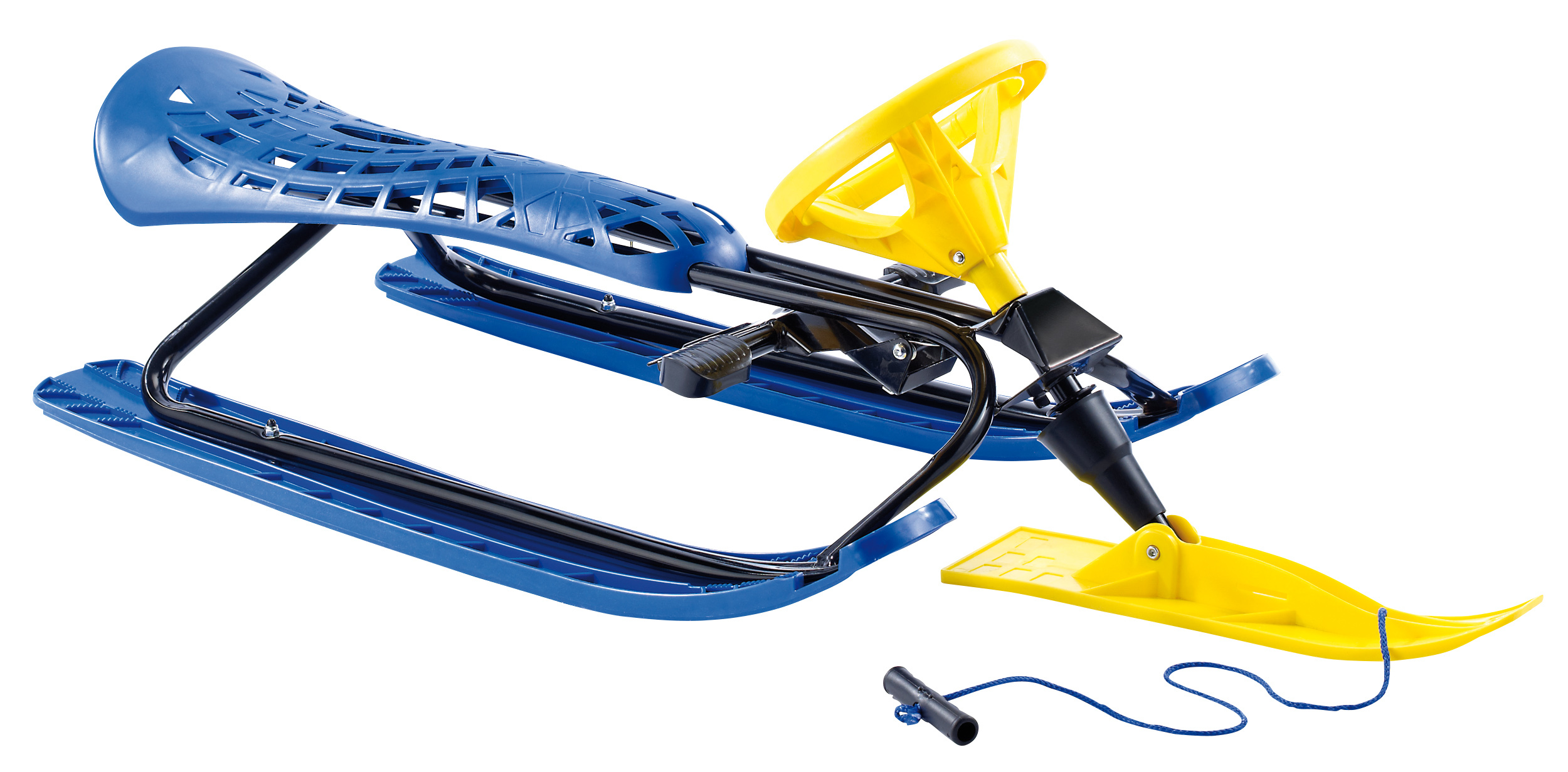 Verglichen mit den anderen beiden hier vorgestellten Modellen ist der Speeron Lenkschlitten aus Carbonstahl mit 5,6 Kilogramm nicht gerade ein Leichtgewicht. Dennoch lässt er sich locker den Berg hochziehen. Dafür ist das Gerät ein echter Pistenflitzer, der Rodelspaß in Reinkultur verspricht. Seine Carbonstahl-Konstruktion ist hochwertig verarbeitet und erlaubt eine Maximalbelastung durch das Gewicht des Fahrers von 100 kg. Auch diese Variante hat die praktischen Kunststoffkufen an Bord, die ein optimales Gleitverhalten liefern. Im Zusammenspiel mit dem großen und griffigen Lenkrad hält der Fahrer seinen Schlitten sicher in der Spur. Und falls er doch mal auf Abwege gerät, sorgen zwei eingebaute Antiblockier-Fußbremsen für die notwendige Sicherheit.