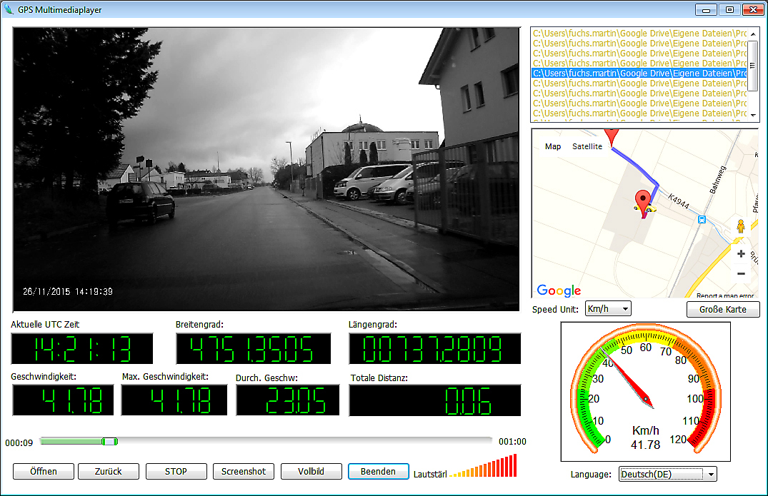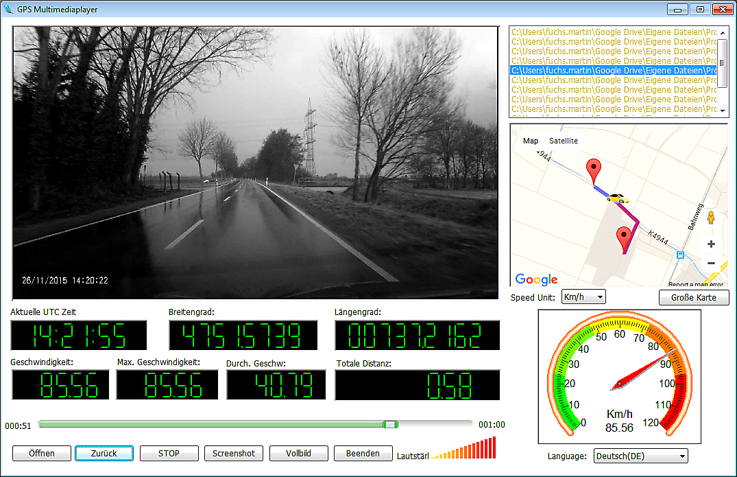 GPS-Software: zeigt zu den Videos die Route auf Google Maps, mit Positions- und Geschwindigkeitsdaten