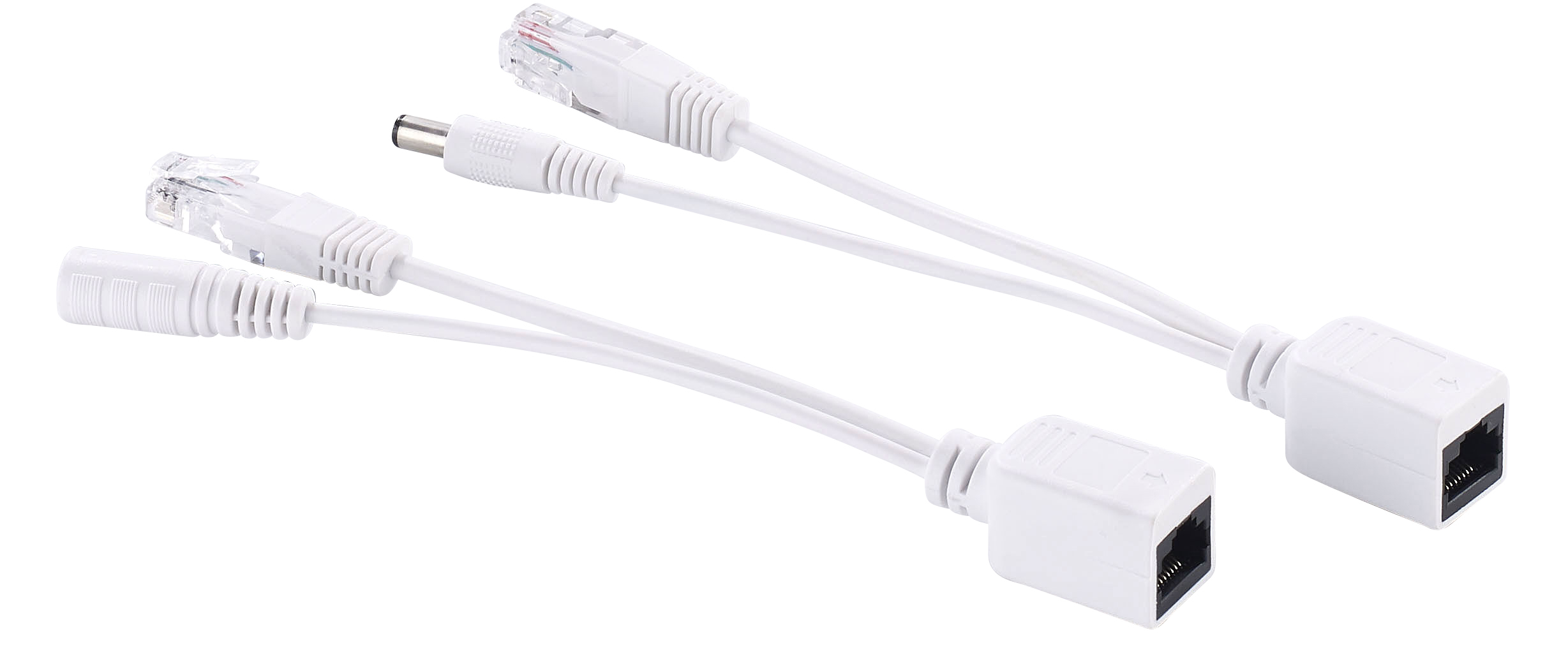 - Ausgangskabel (Kamera-seitig): RJ45-PoE-Buchse, DC-Stecker für Kamera, RJ45- Netzwerk-Stecker
