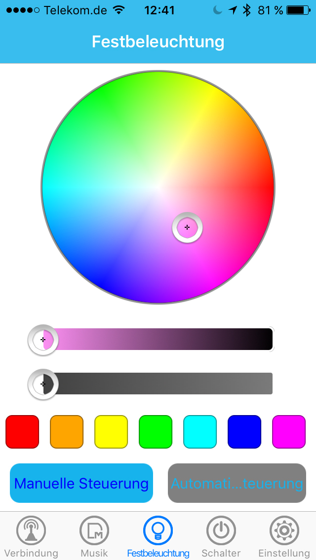 Passend zur Musik kann man die Lichtstimmung aus 7 voreingestellten Farben oder aus dem gesamten Farbraum auswählen. Und dem entspannten oder gar romantischen Abend steht nichts mehr im Weg.