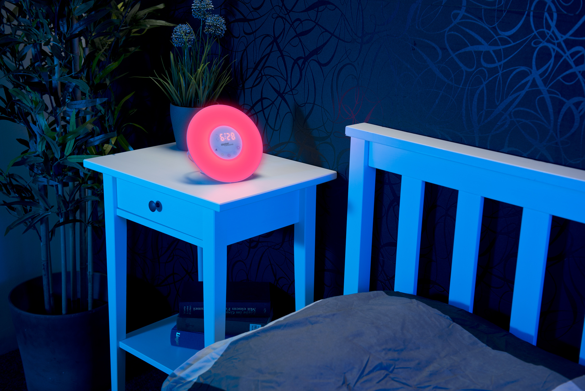 Nachttisch-Leuchte mit den Wunschfarben: Der Licht-Wecker spendet außerdem Licht in der Wunschfarbe. Er dient sogar als helle Leseleuchte.