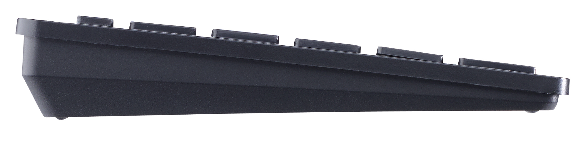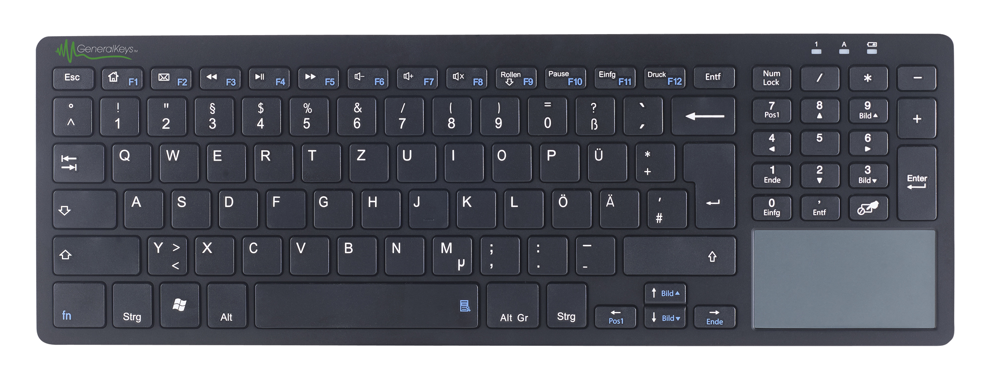 Mehr Platz auf dem Schreibtisch: Dank integriertem Touchpad kann man die 2,4-GHz-Funktastatur auch als Maus verwenden! Und Zahlen tippt man ganz einfach über den Nummernblock ein.