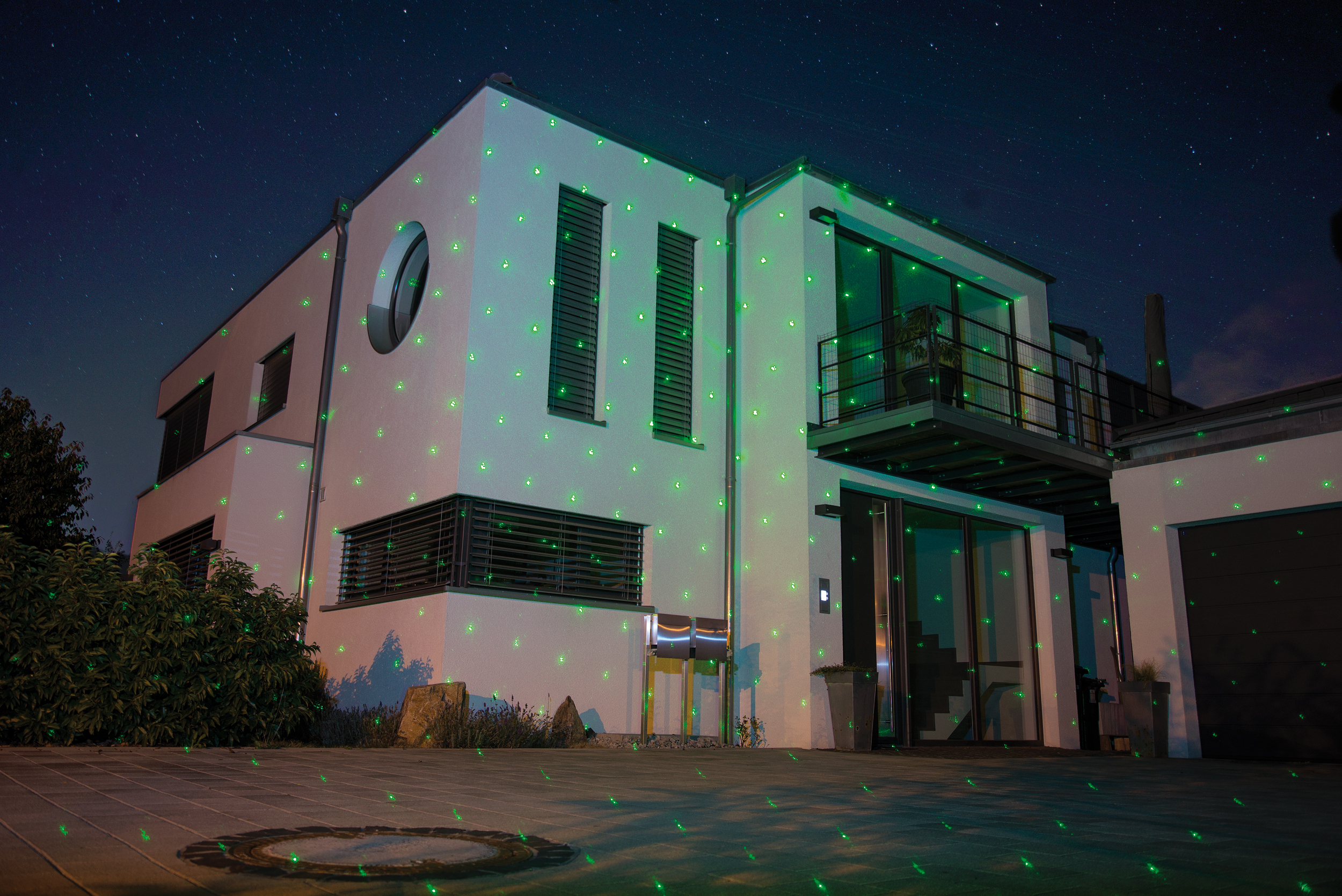 Beleuchtung von Garten und Hausfassade: Dank spritzwassergeschütztem Gehäuse lässt sich der Projektor innen wie außen nutzen. Ob im Sommer für die Garten-Party oder im Winter als Weihnachtsbeleuchtung, er sorgt garantiert für zauberhafte Momente.