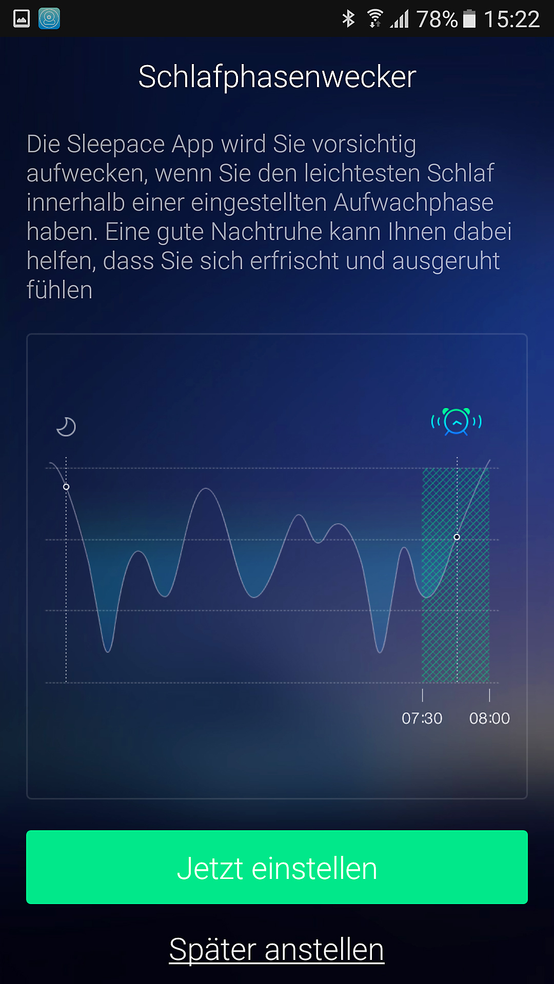 Erholt aufwachen: Anstatt einer festen Weckzeit, legt man einen Weck-Zeitraum fest. Der Tracker weckt dann automatisch, wenn man sich innerhalb dieses Zeitraums in einer Leichtschlaf-Phase befinden. So fällt das Aufstehen leichter und man fühlt sich tagsüber ausgeschlafen!