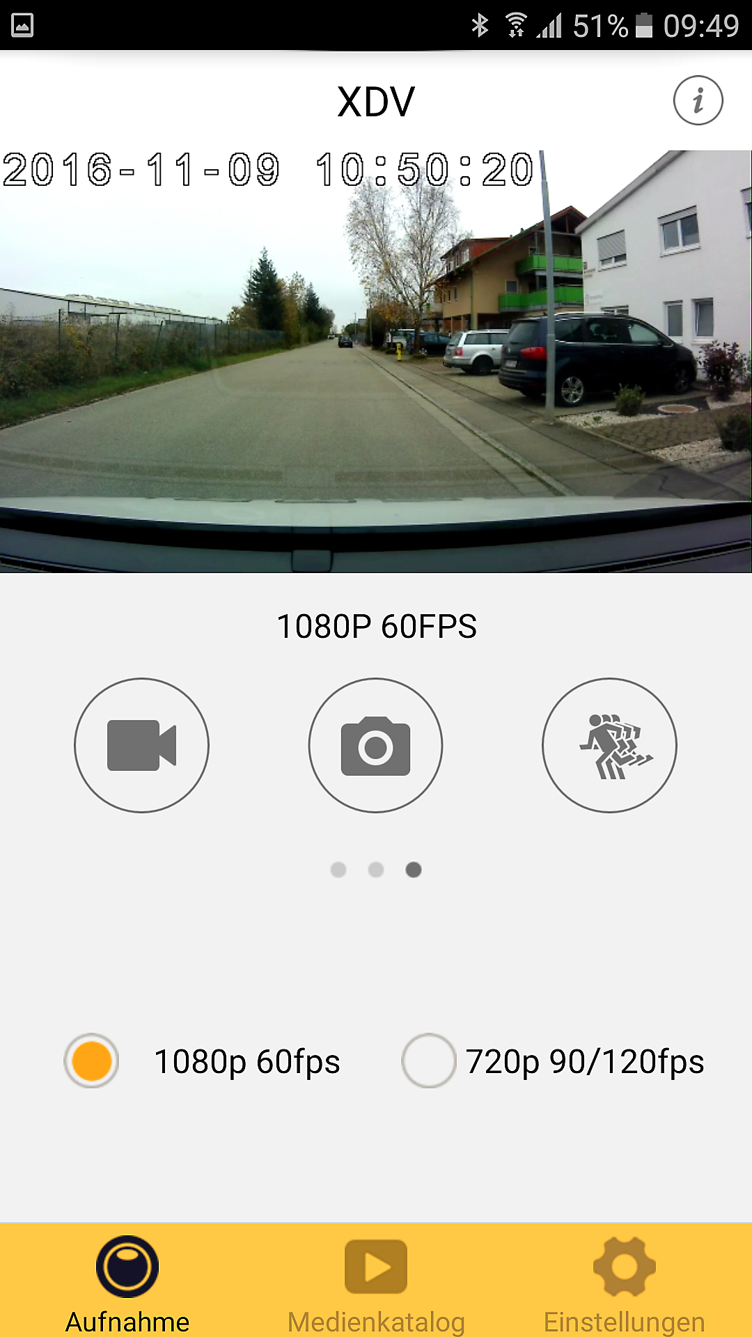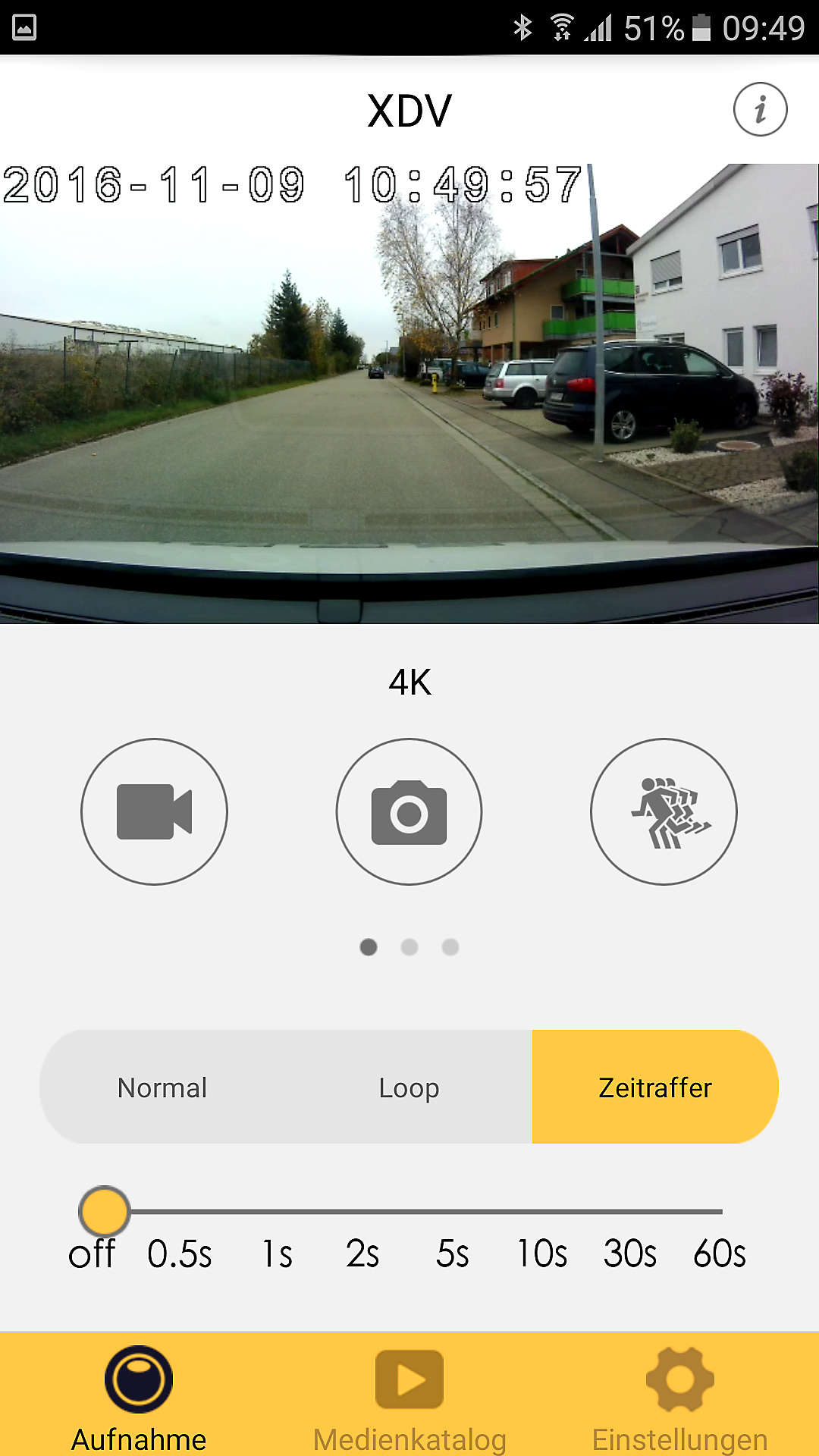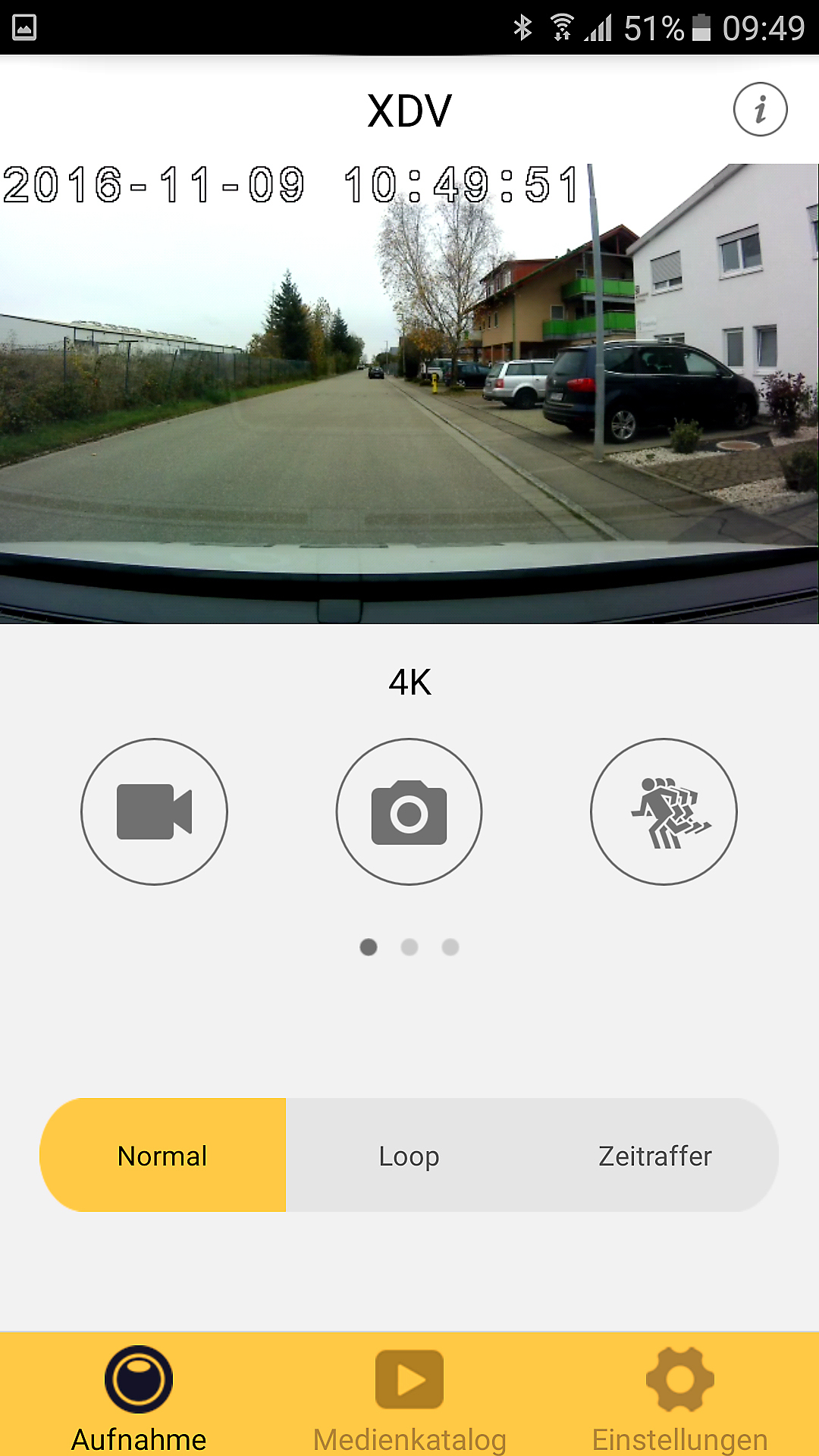 Volle Kontrolle mit dem Smartphone: Per kostenloser App für Android und iOS lassen sich sämtliche Einstellungen bequem auf dem Mobilgerät vornehmen: Die Aufnahmen der Autokamera sieht man auf dem Smartphone an, speichert interessante Aufnahmen und löscht nicht benötigte Aufnahmen per Fingertipp.