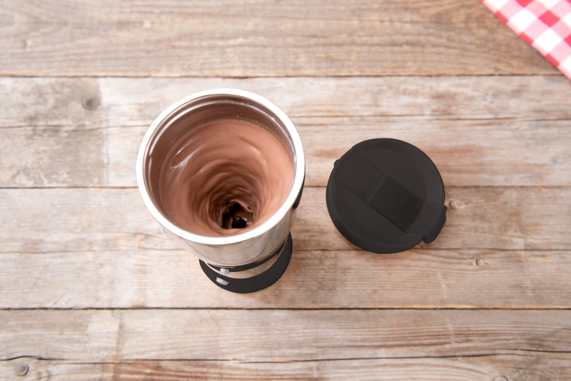 Aufwasch sparen: Ab jetzt spült man nicht mehr Tassen und Löffel. Der selbstrührende Thermobecher ist Mixer und Becher in einem.