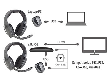 Passend für PC, Notebook und Spielekonsole: Der Funk-Sender wird per USB an den Windows-PC angeschlossen und so mit Strom versorgt und gleichzeitig mit dem Audiosignal gespeist. Mit Mac und Spielekonsole ohne optischem Anschluss wird das Headset einfach per Audiokabel verbunden.