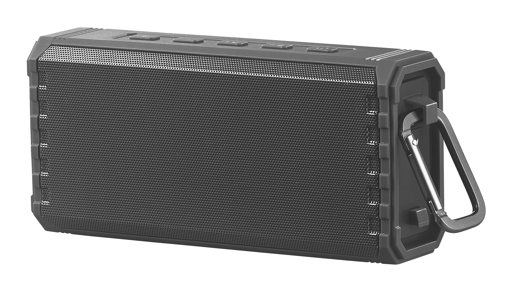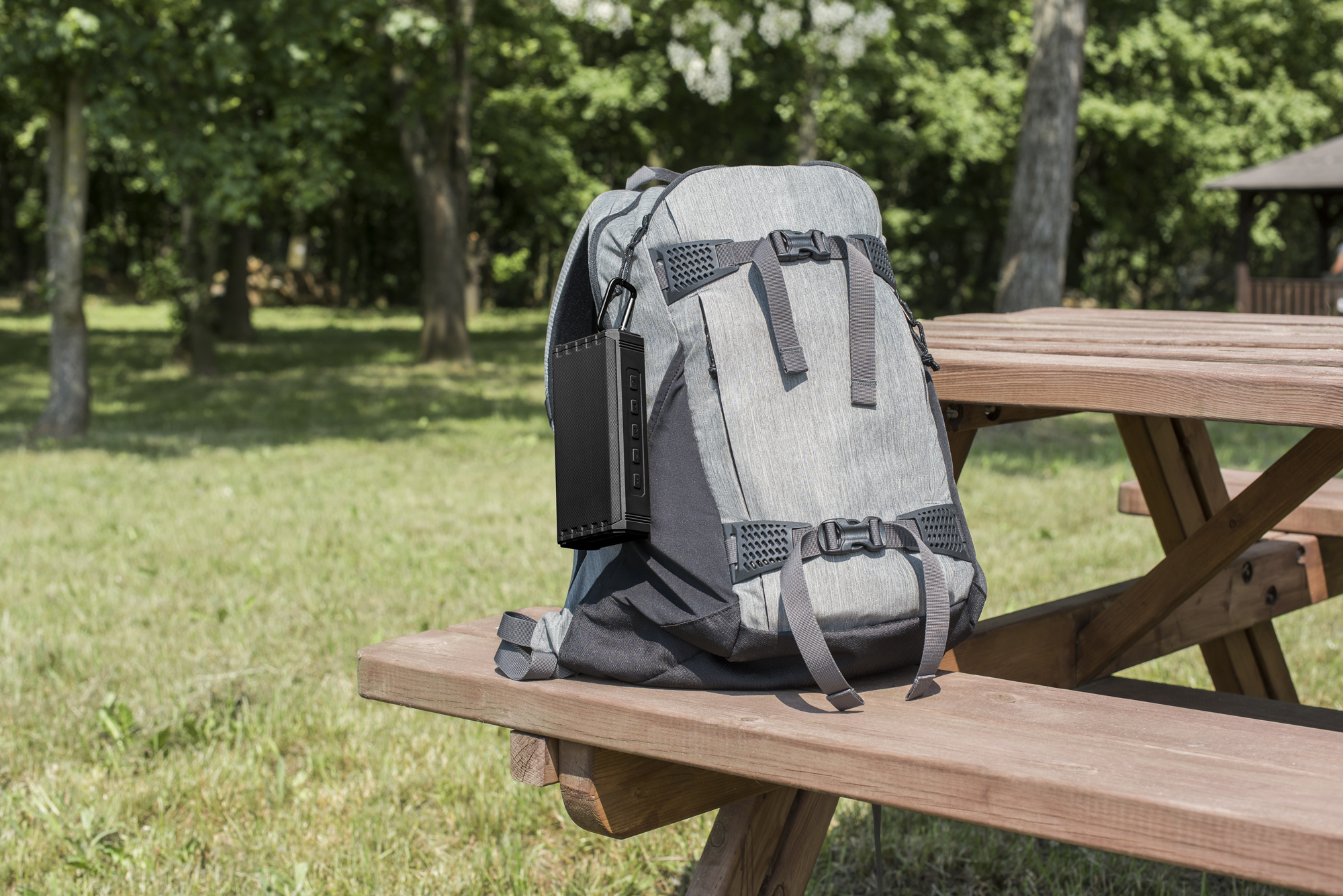 Bequem mitnehmen: Dank kompakter Maße und Karabiner-Haken hängt man den Lautsprecher einfach an Tasche, Backpack oder Rucksack. Und mit bis zu 12 Stunden Akku-Laufzeit sorgt er auch bei langen Ausflügen für die ideale Musik-Stimmung.