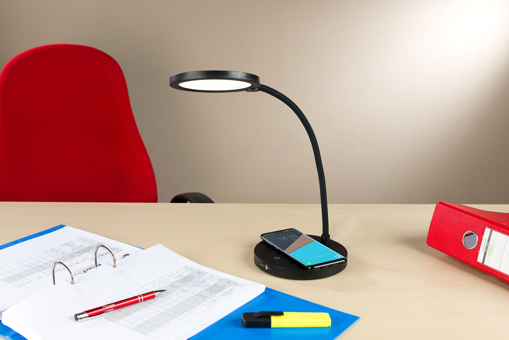 Das Smartphone kabellos laden: Einfach das Qi-kompatible Mobilgerät zum Aufladen auf den Lampenfuß legen. Per elektromagnetischer Induktion wird der Akku mit neuer Energie versorgt.