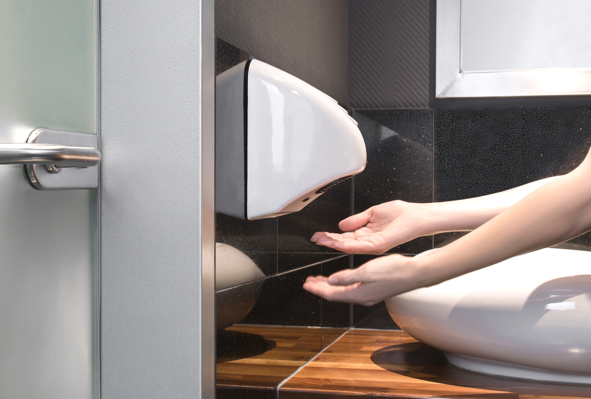 Die Hände in Sekunden trocken und umweltschonend Hand- und Papiertücher ersetzen. So entfällt Papiermüll und man wäscht weniger. Das spart Geld und Energie und ist gut für die Umwelt!