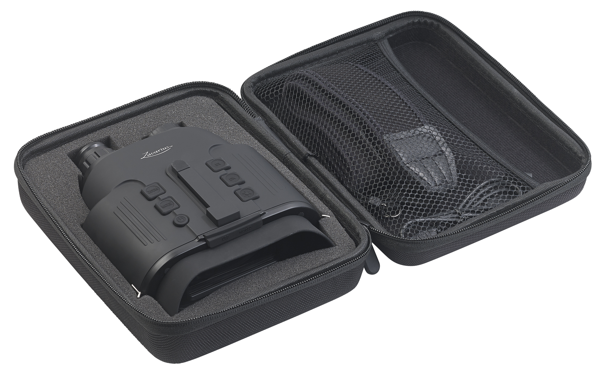Transportieren leichtgemacht: In der praktischen Tasche ist das Binokular sicher aufbewahrt. Und auf der nächtlichen Pirsch trägt man es dank gepolstertem Nackenriemen bequem um den Hals.