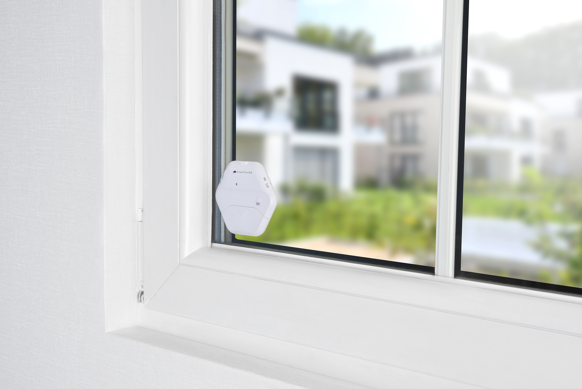Kinderleichtes Handling: Im Handumdrehen lässt sich der Melder mittels vormontiertem Klebepad am Fenster anbringen. Dann noch die Empfindlichkeit einstellen - fertig!