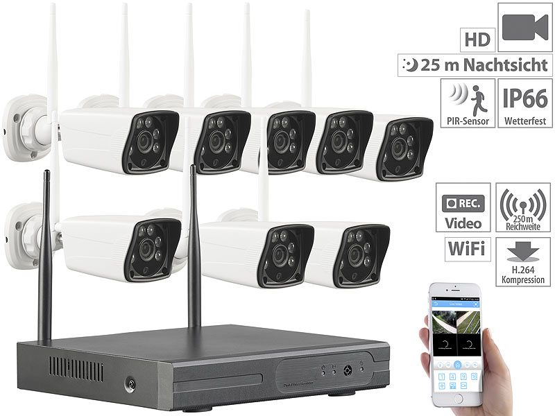 8 Funk-Überwachungskameras mit je: