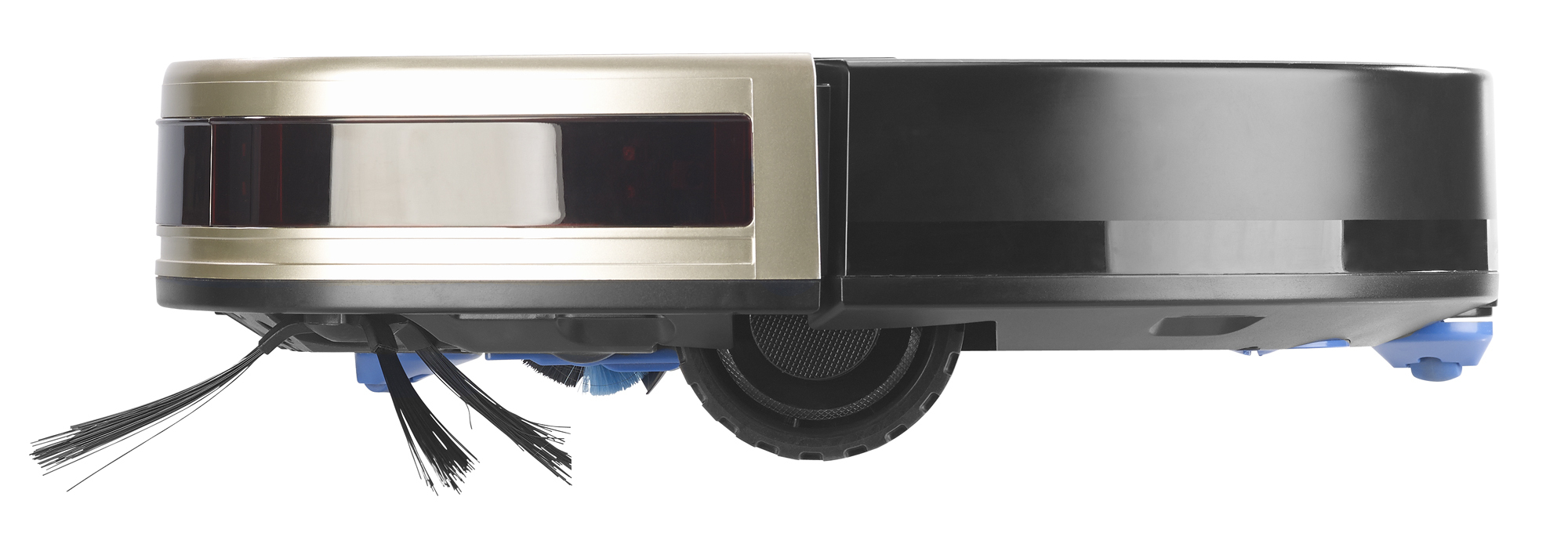 Kommt überall hin: Dank flachem Design fährt der Roboter mühelos z.B. unter Sofa, Bett und Kommode. Auch an den Rändern beseitigt er Schmutz mithilfe seiner langen rotierenden Seitenbürsten.