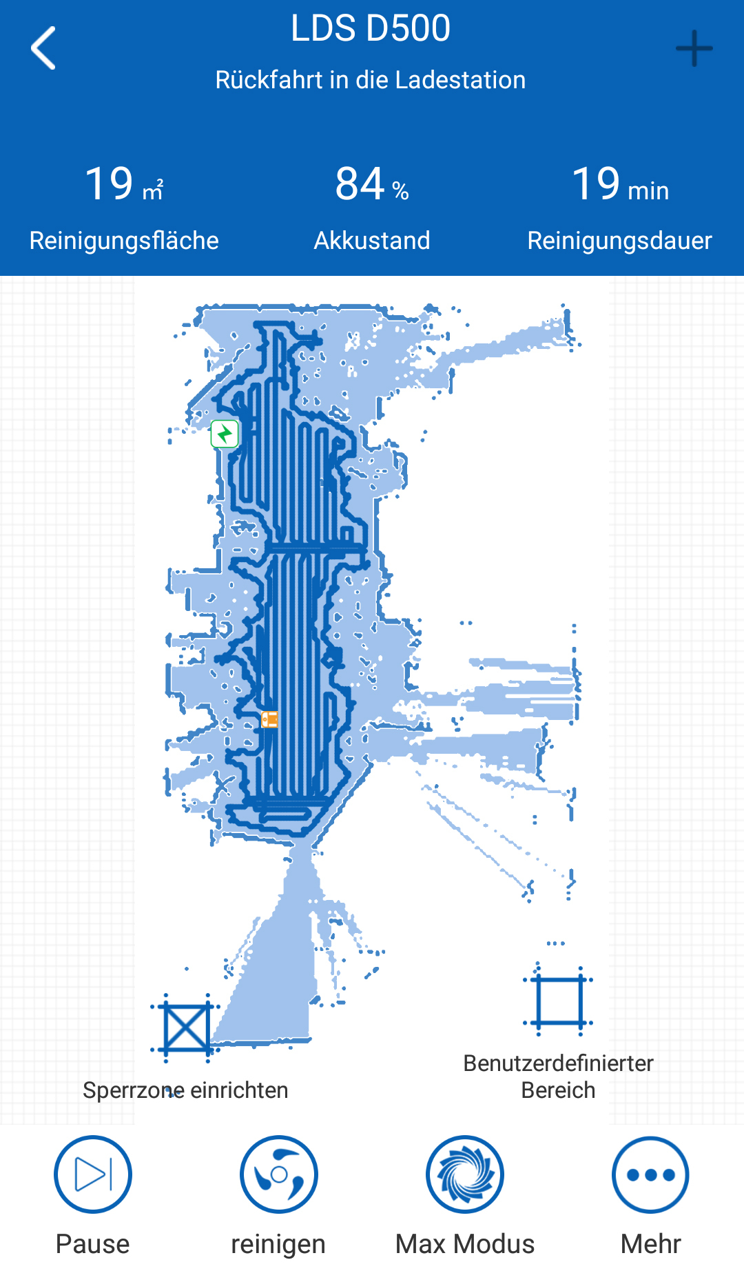 Putzt besonders ausdauernd: Mit einer Akkuladung macht der Roboter bis zu 135 Minuten lang sauber. Anschließend fährt er selbstständig zur Ladestation um aufzutanken.
