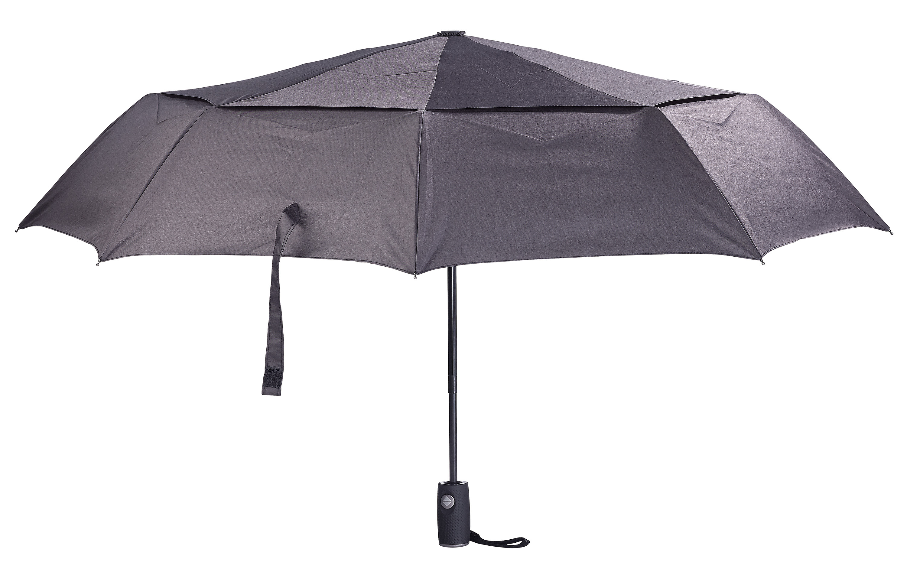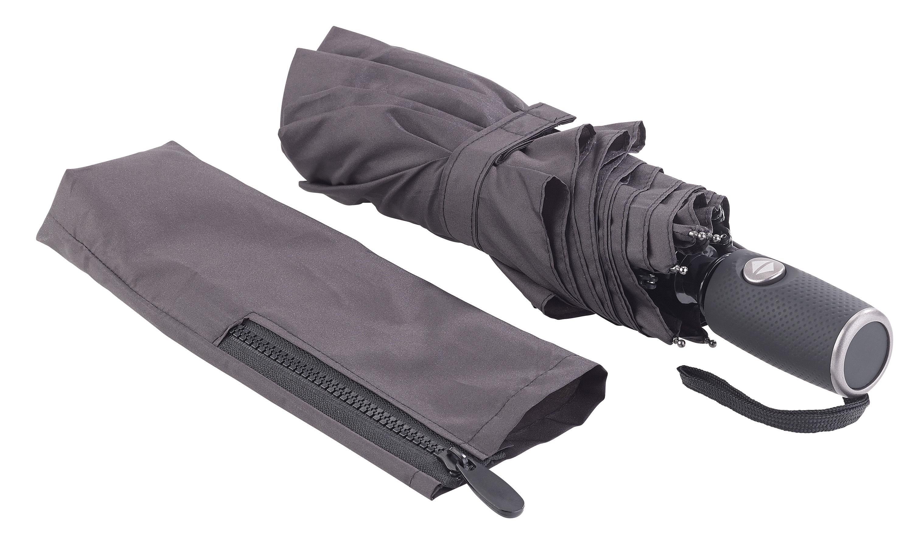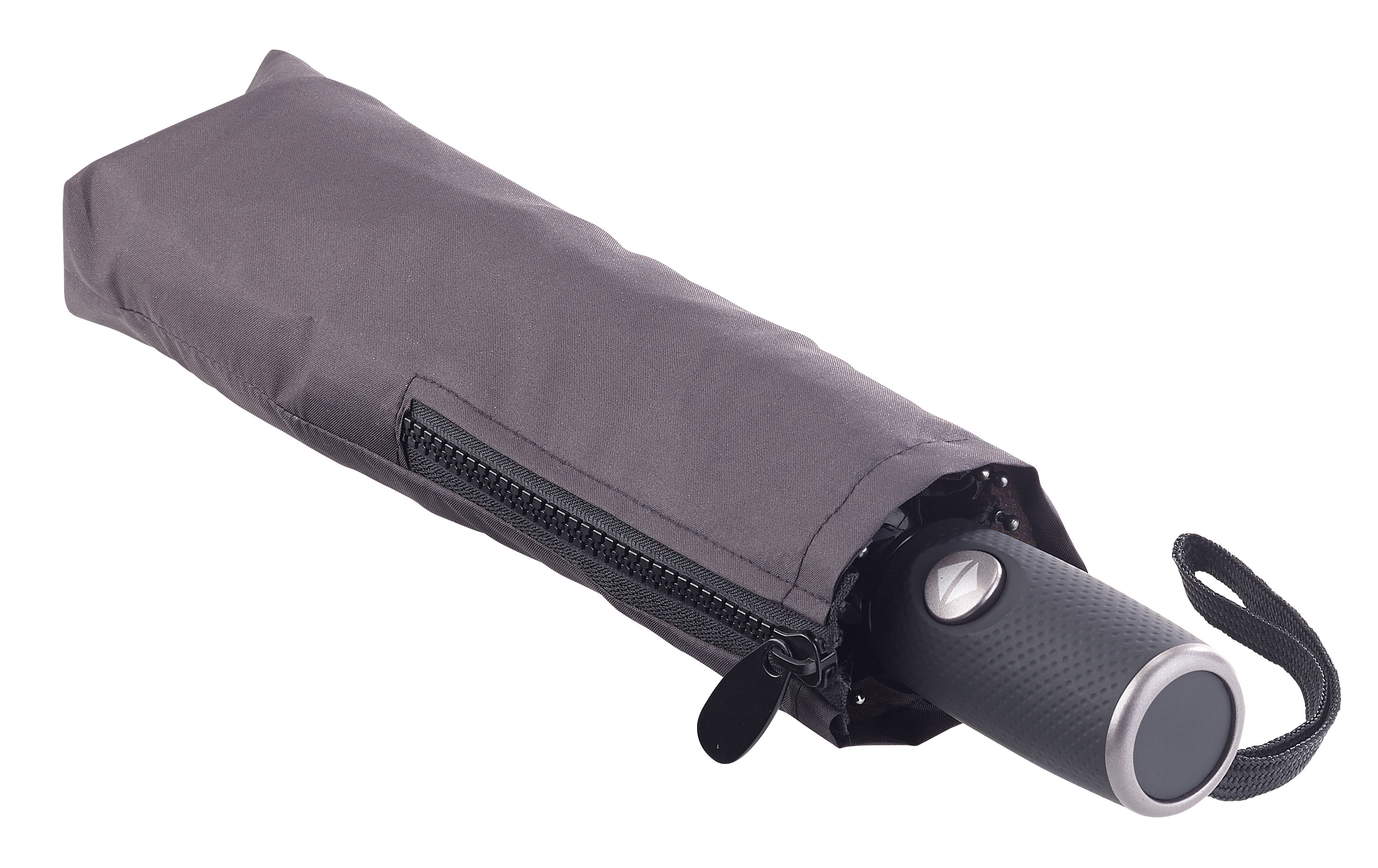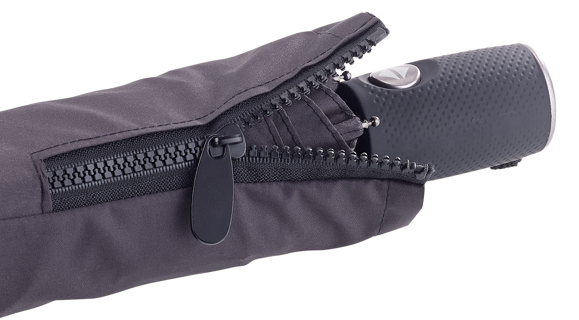 Praktische Einhand-Bedienung: Per Knopfdruck öffnet und schließt man den Schirm ganz bequem mit nur einer Hand. Der gummierte Griff sorgt für sicheren Halt auch bei Nässe.