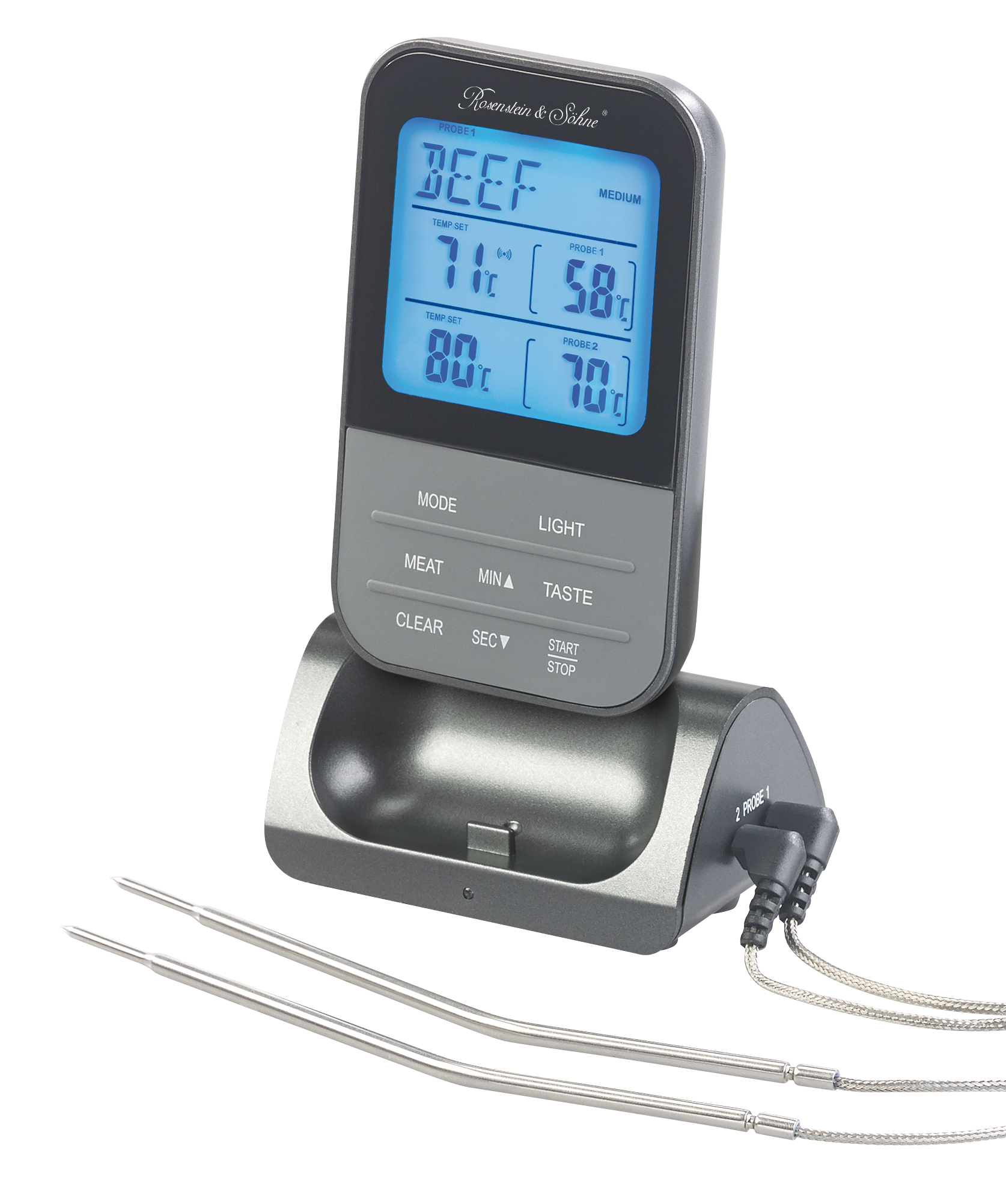 Stets an der Seite: Alle Einstellungen nimmt man bequem am Mobilteil mit XL-Display vor. Die Funk-Basis mit den zwei Temperatur-Fühlern für das Fleisch verbleiben einfach in Grill- oder Ofen-Nähe.