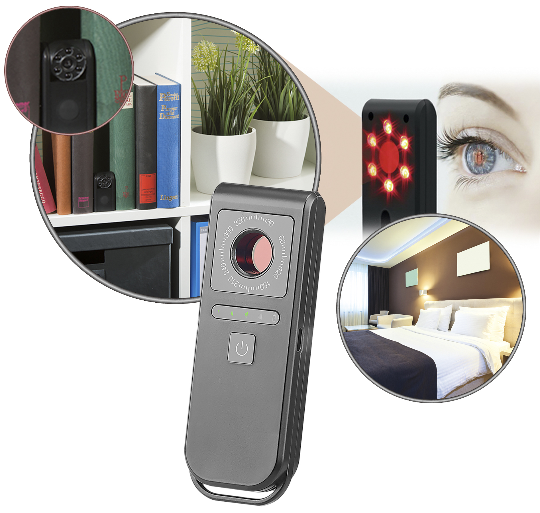 Ungewollter Überwachung einen Riegel vorschieben: Die Infrarot-LEDs des Spy-Cam-Detektors von VisorTech enttarnen rasch jede versteckte Kamera - ob in Umkleidekabine oder Hotelzimmer.