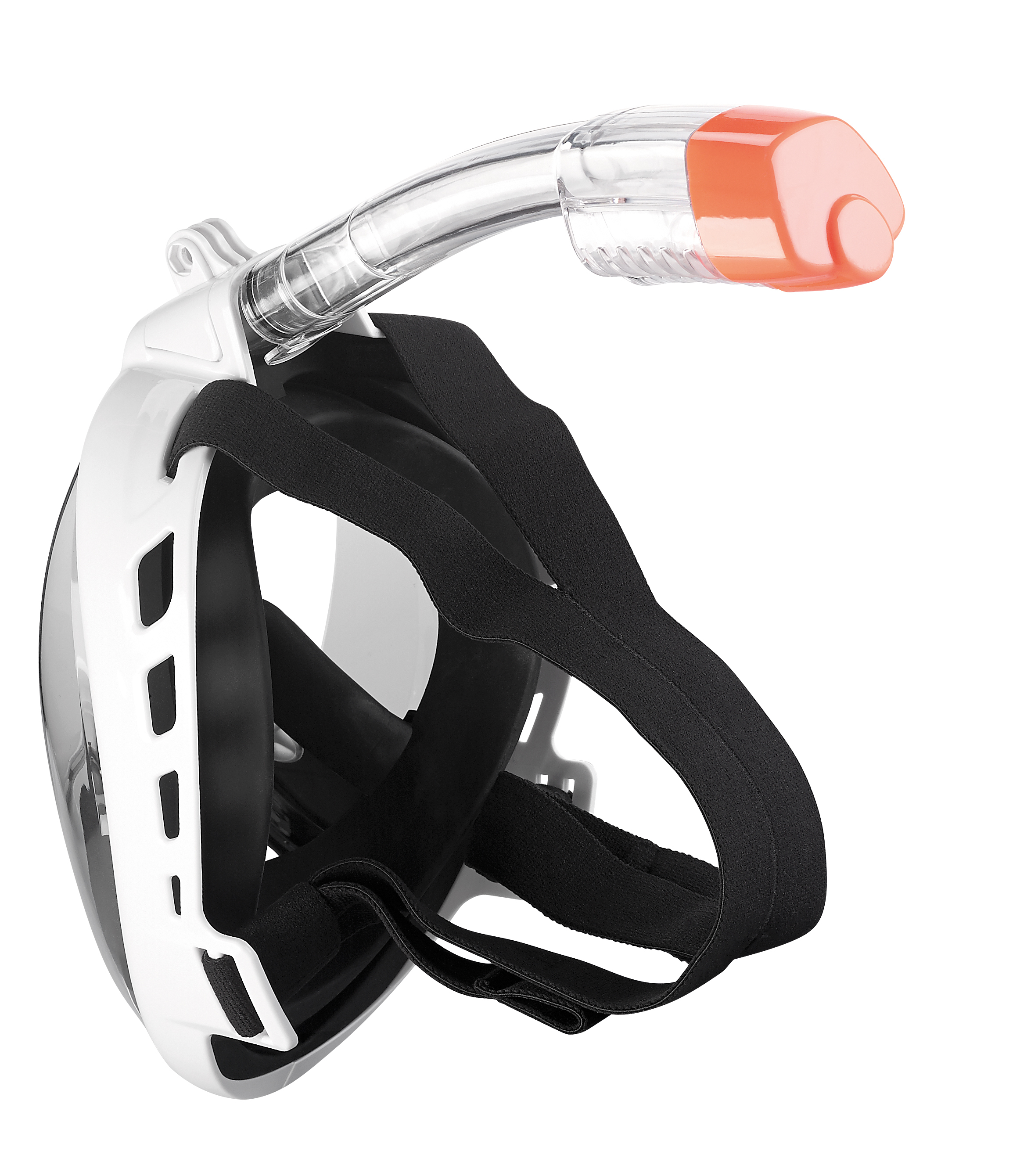 Klarer 180°-Panorama-Blick auf die Unterwasserwelt dank des großen Sichtfensters - als schaute man aus dem Bullauge auf Kapitän Nemos Nautilus! Zwei Atem-Ventile in der Maske verhindern das Beschlagen von innen. Und dank Action-Cam-Halterung nimmt man sogar die Kamera mit und filmt seine Abenteuer-Reise!