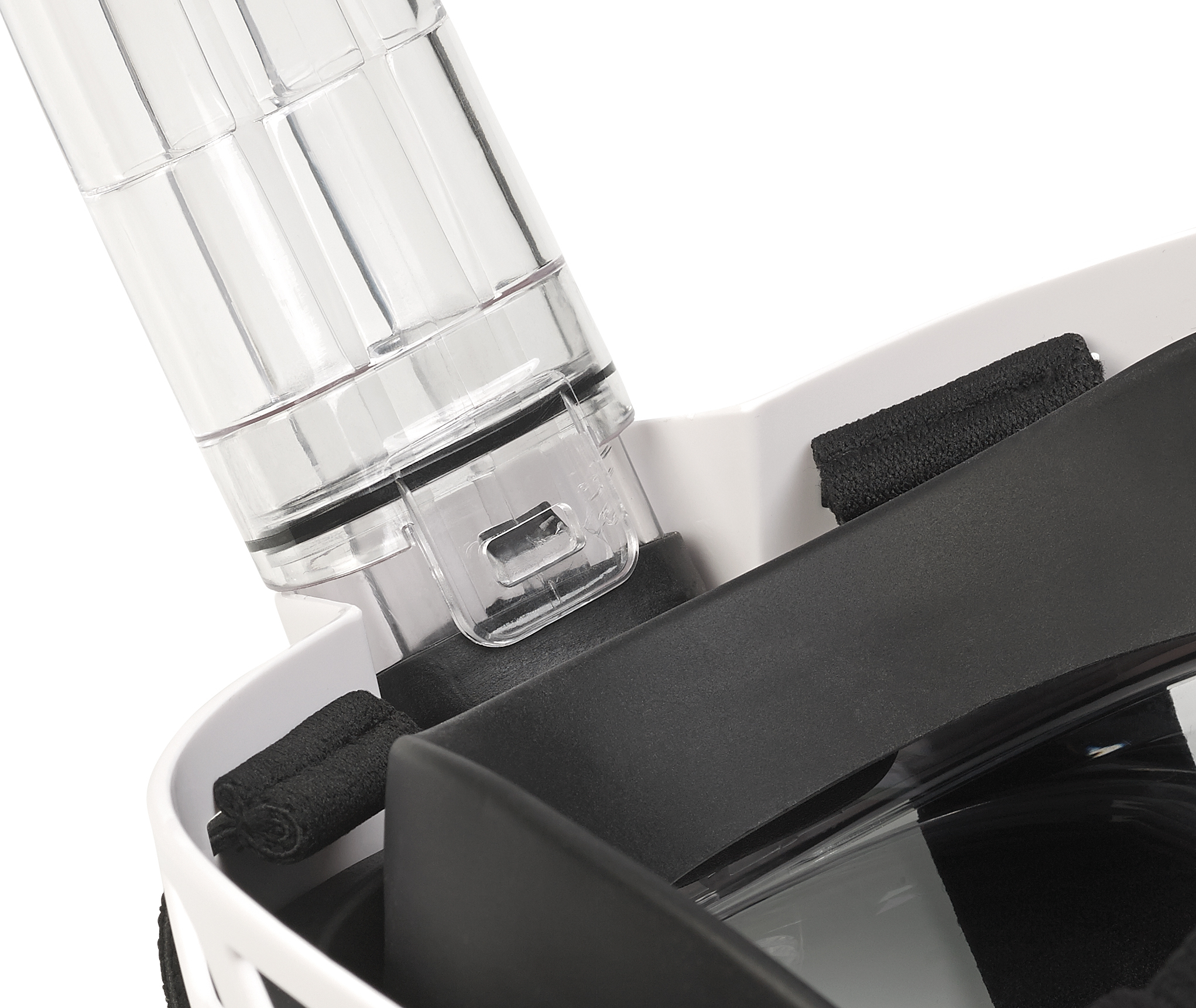 Bequem zu tragen: Der weiche Silikon-Rand der Maske passt sich dem Gesicht an und dichtet es von der Stirn bis zum Kinn ab. Den Riemen verstellt man individuell nach der Kopfgröße. So kommen Augen, Nase und Mund nicht mit dem kühlen Nass in Berührung.
