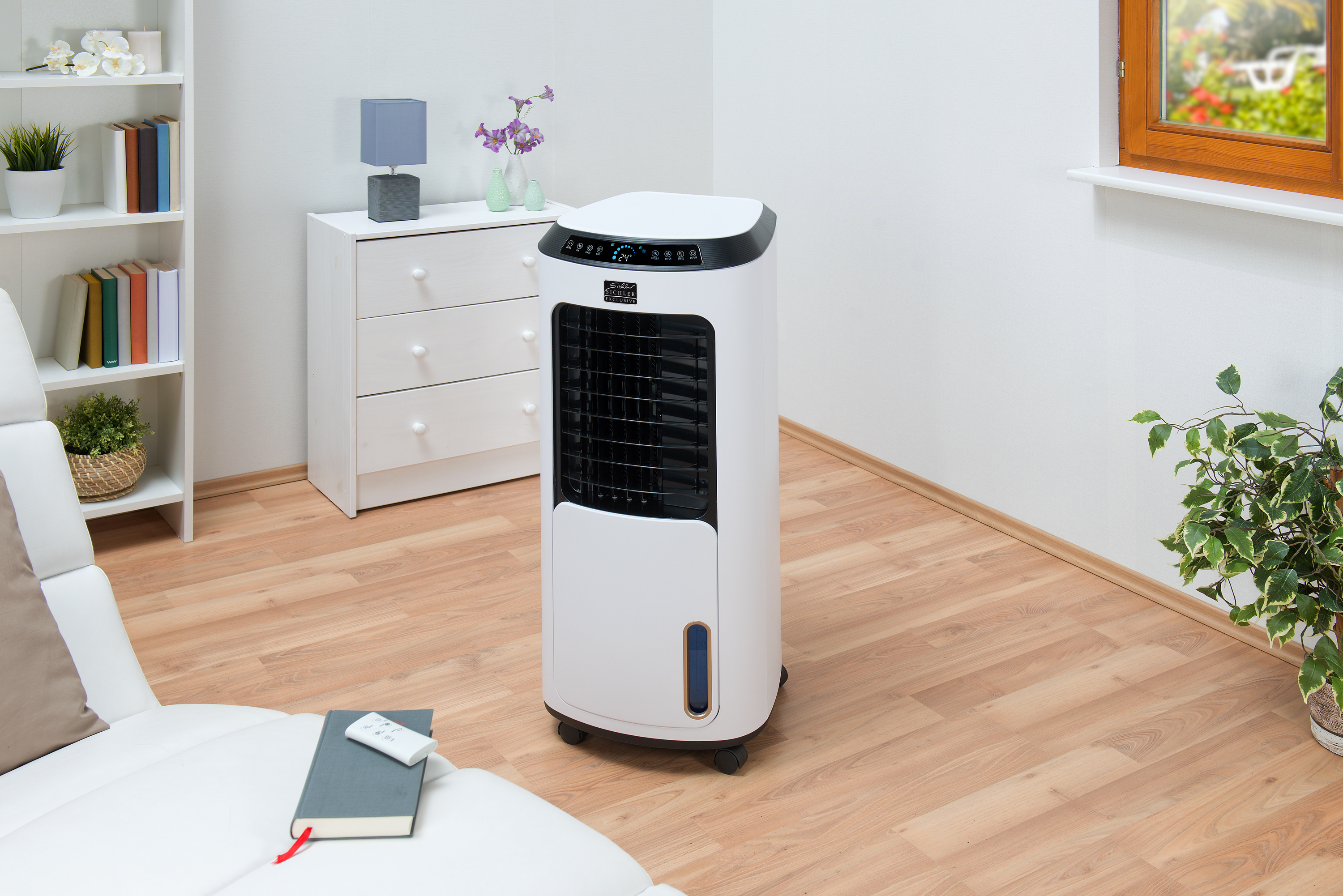 Abhilfe bei sommerlicher Hitze mit trockener Luft: Denn der Raumluft-Kühler von Sichler Exclusive mit Wabenfilter erzeugt eine wohltuende Verdunstungskälte. Und das bei gleichzeitig angenehmer Luftfeuchtigkeit! Das Wasser hierfür kühlt er selbstständig auf frische 8 °C.
