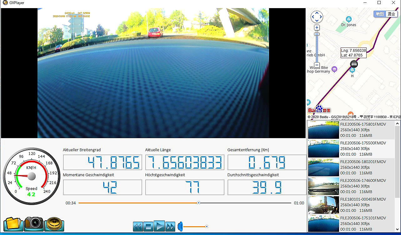Hinweis: Die Software GV-Player zum Auslesen der GPS-Daten und Geschwindigkeit kann man im PEARL-Onlineshop kostenlos herunterladen: https://www.pearl.de/support/product.jsp?pdid=NX4820&catid=1321