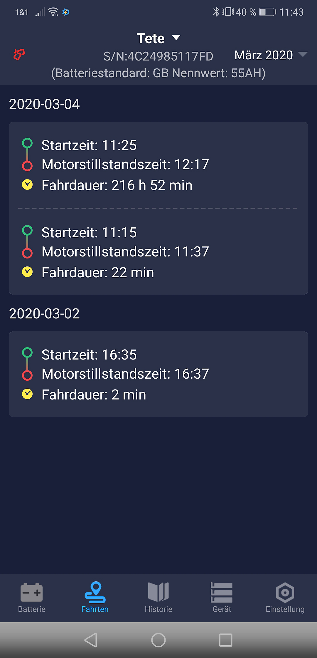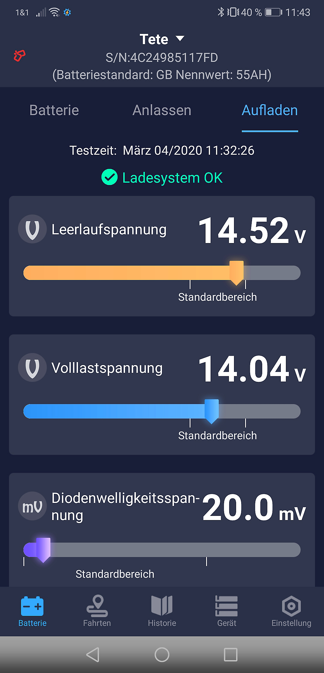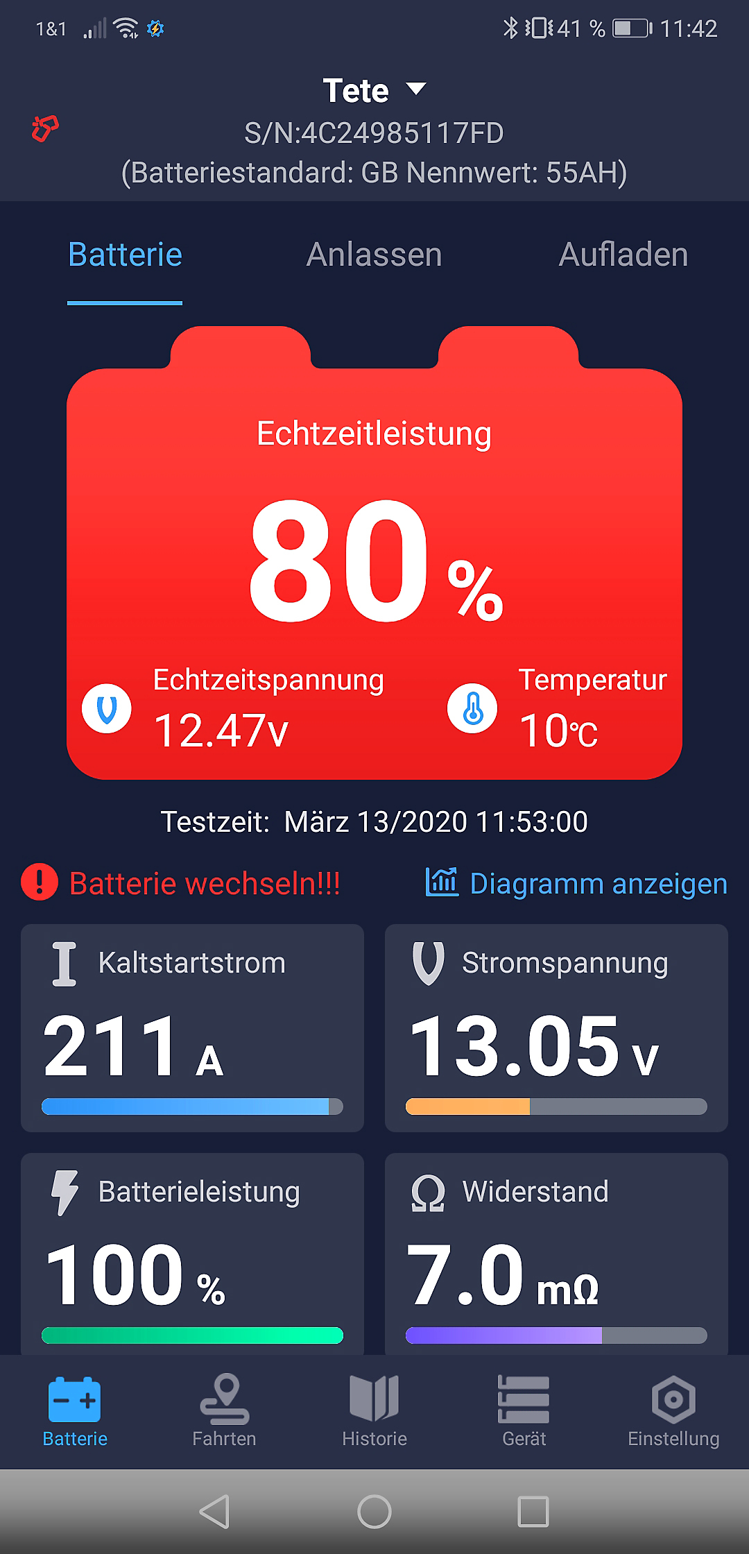 Einfache Langzeit-Auswertung, auch zum Ausdrucken: Die App zeigt grafisch die gesammelten Batterie-Daten. So erkennt man frühzeitig, wann Handlungsbedarf besteht und die Batterie ausgetauscht werden sollte.