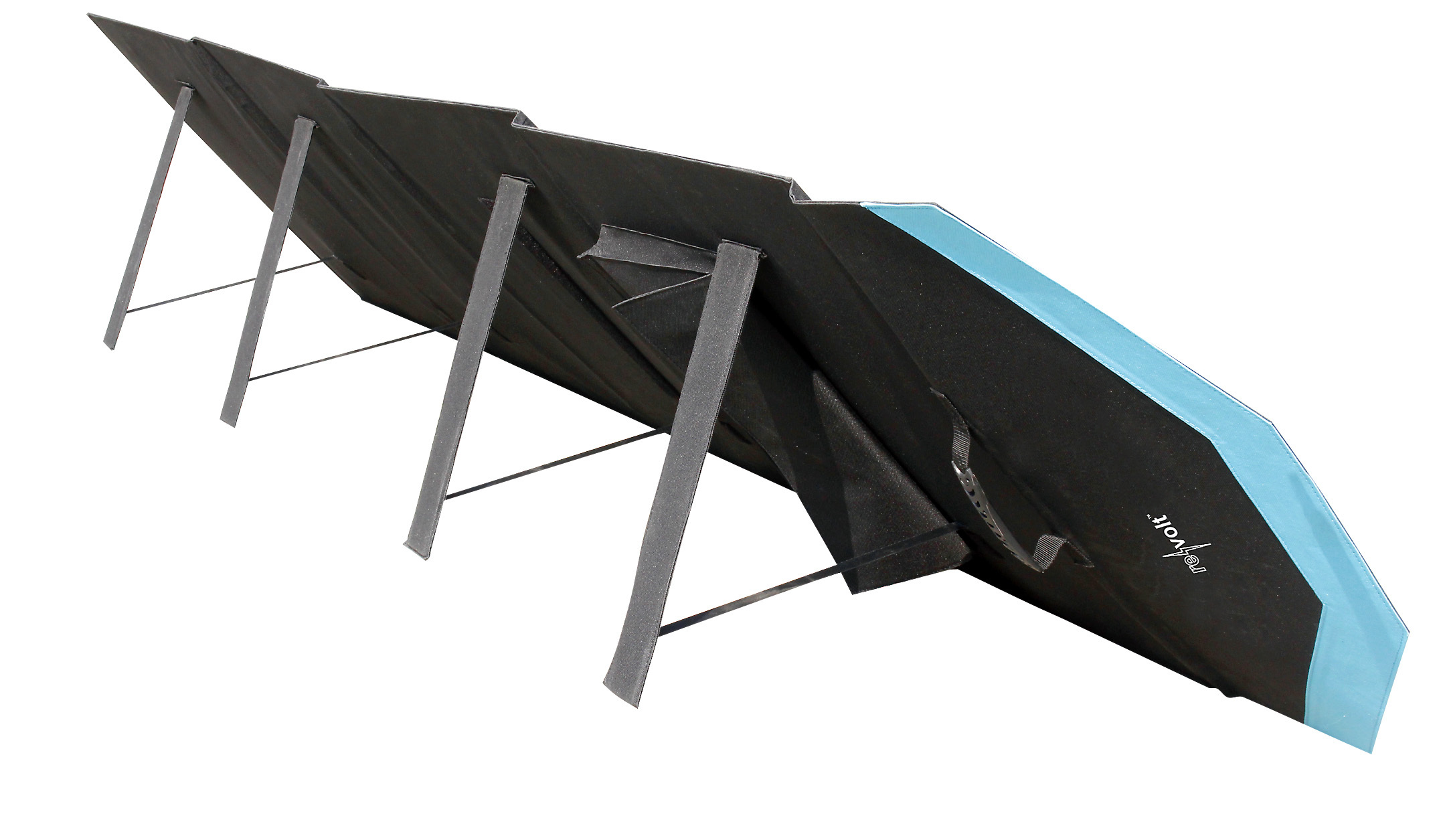 Leicht zu transportieren: Das Panel besteht aus 4 riesigen Solarzellen, die auf der Innenseite einer Tasche angebracht sind. Dadurch faltet man das Panel bequem zusammen. In der Größe einer Aktentasche ist es ideal zum Mitnehmen. In einer kleinen Außentasche findet das Anschlusskabel Platz.
