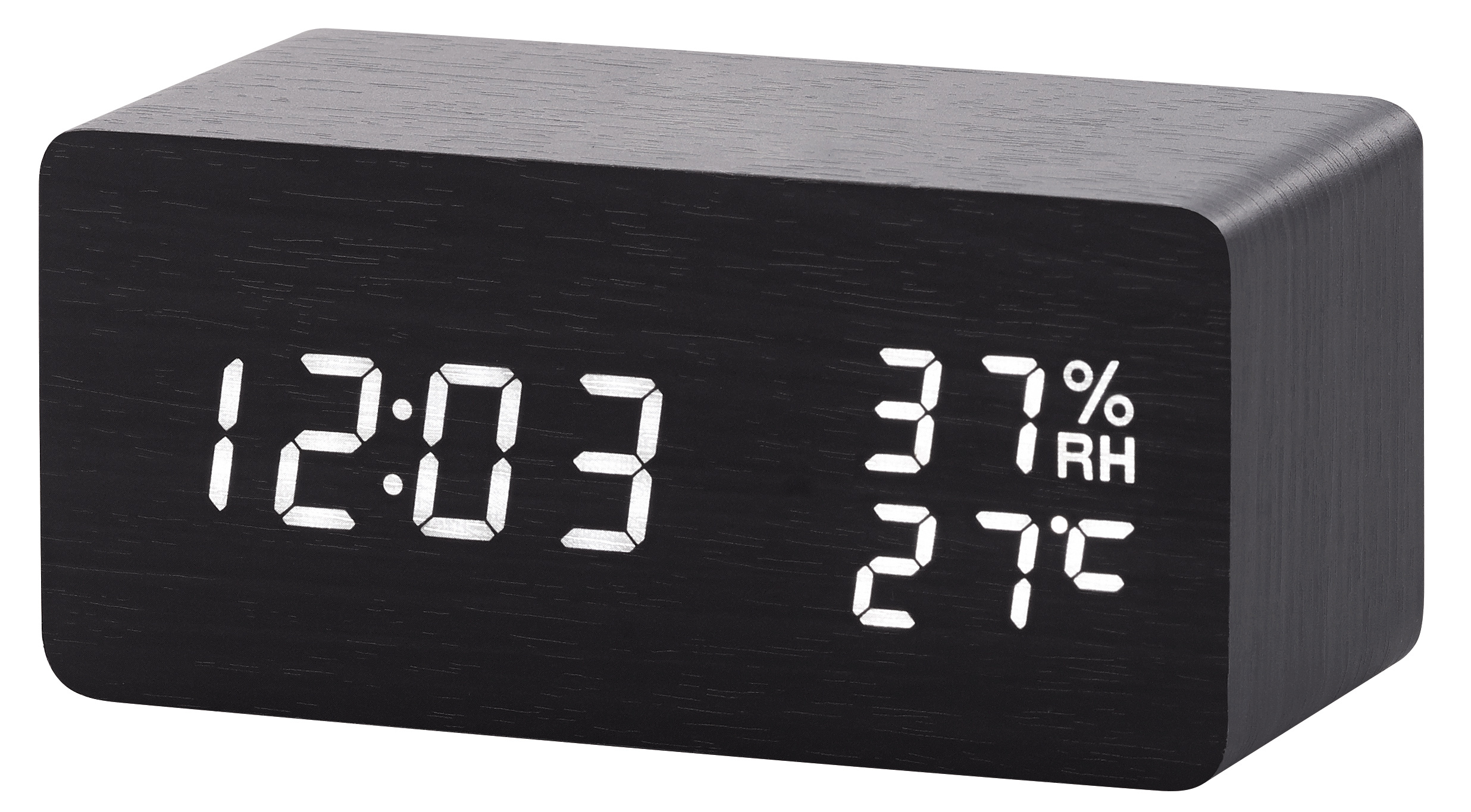 Alle wichtigen Daten auf einen Blick: Uhrzeit, Datum, Temperatur und Luftfeuchtigkeit lassen sich einfach vom extragroßen LED-Display ablesen. Die Helligkeit dimmt man bequem in zwei verschiedenen Stufen.