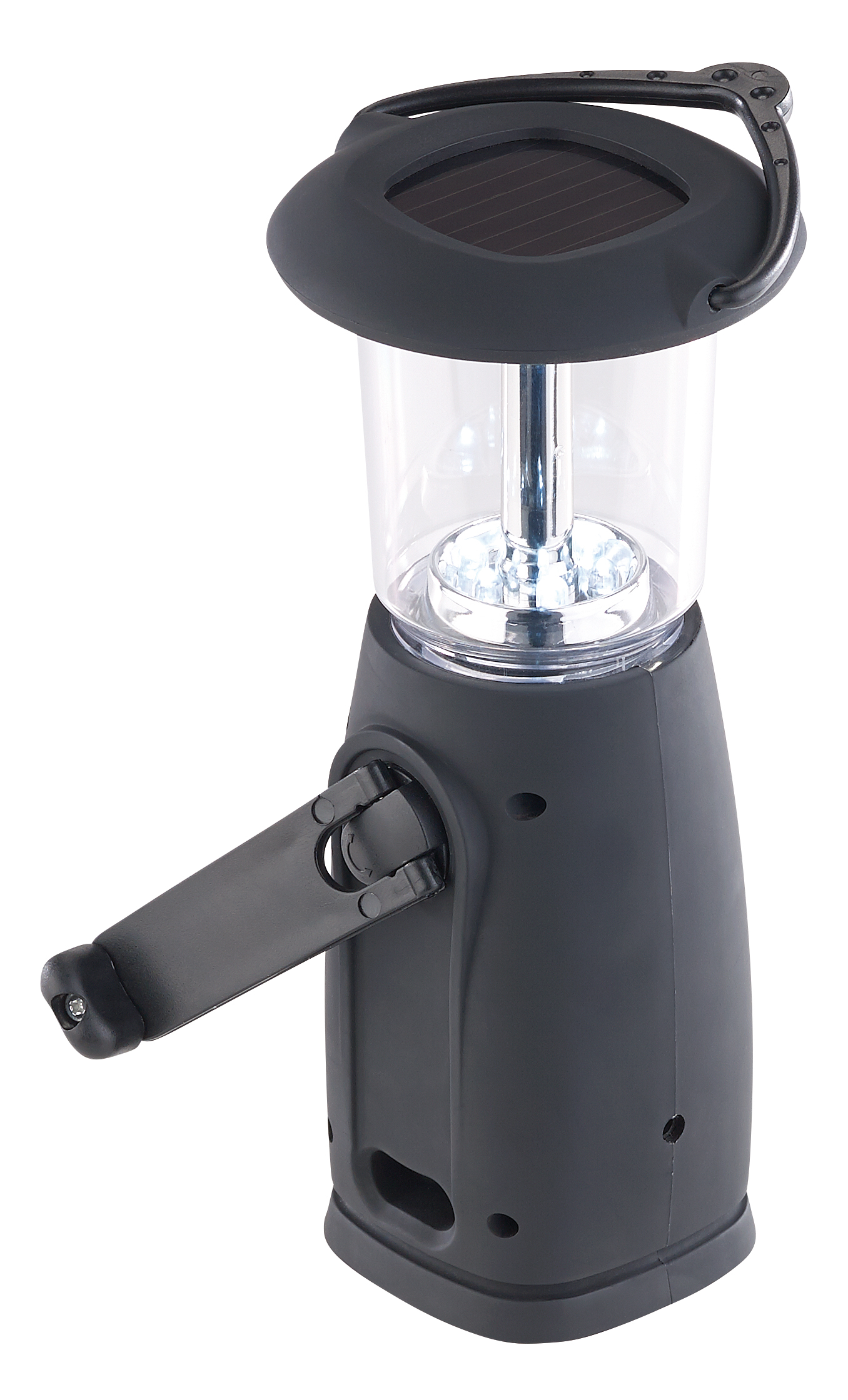 Jederzeit den eigenen Strom erzeugen: Per ausklappbarer Handkurbel produziert man in nur einer Minute kinderleicht Strom für eine Viertelstunde Licht. So lädt man selbst ohne Sonne den Akku auf!