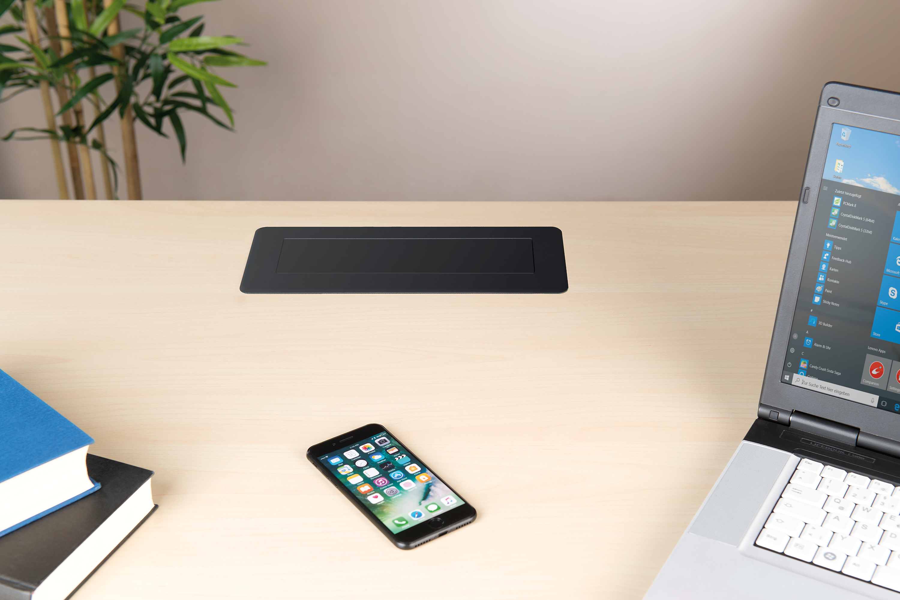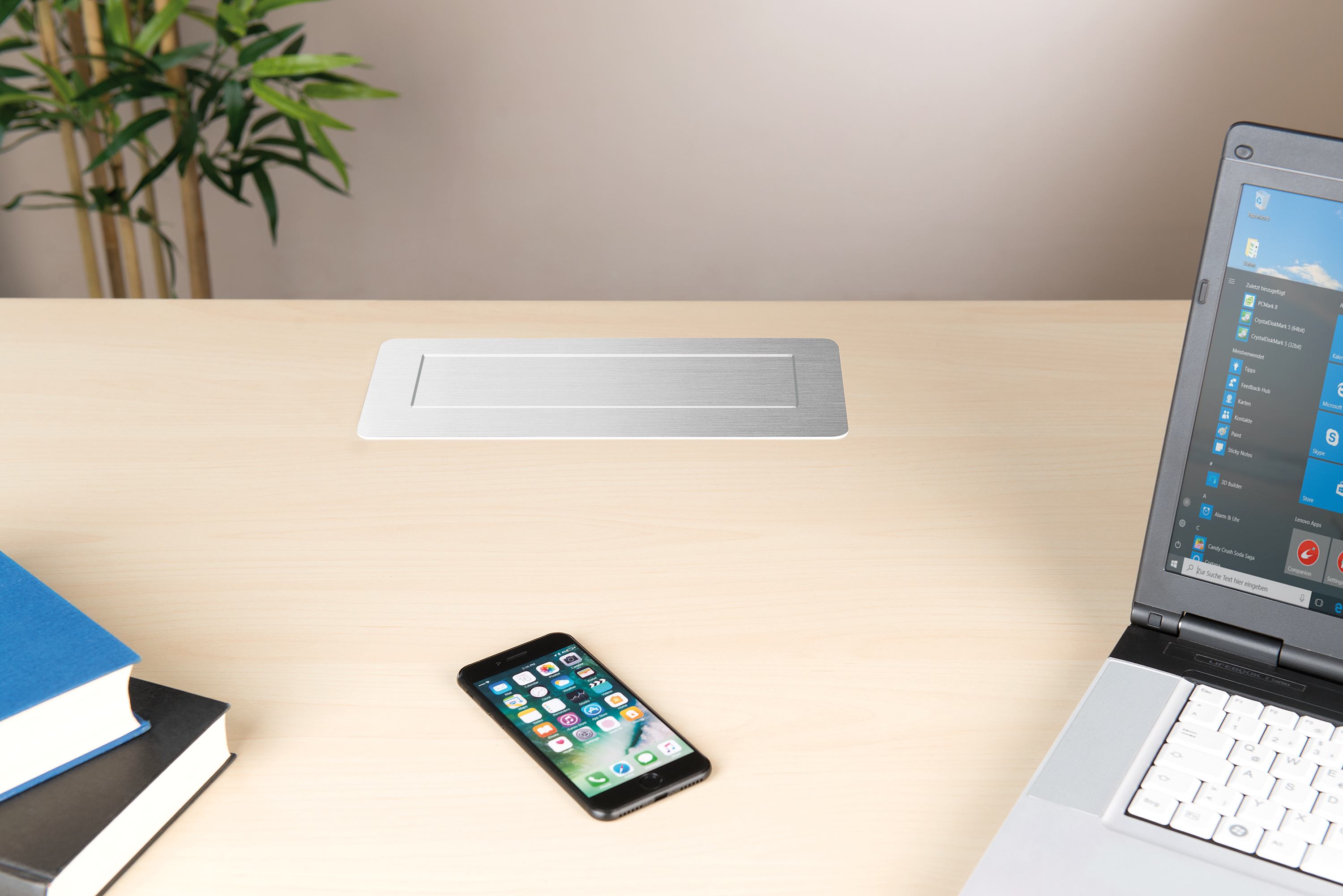 Die versenkbare 3-fach Einbau-Tischsteckdose von revolt schafft Ordnung auf dem Schreibtisch. 3 Steckdosen und 2 USB-Lade-Ports mit Quick Charge-Funktion sorgen immer für die nötige Energie!
