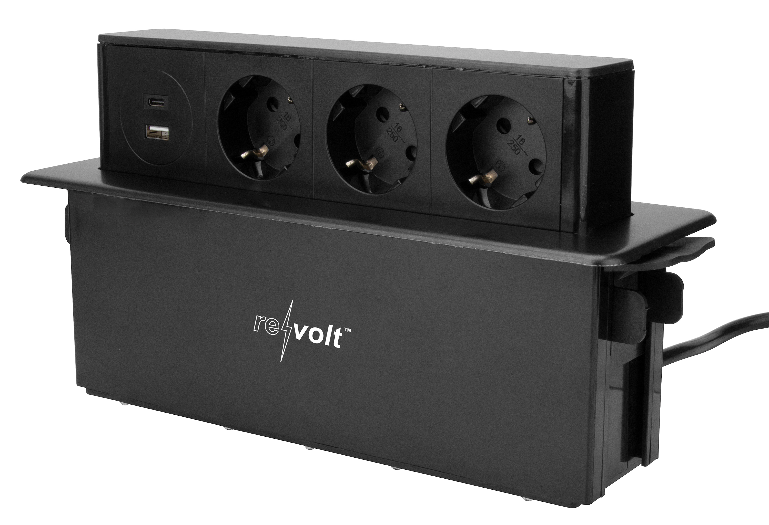 revolt Versenkbare 3-fach Einbau-Tischsteckdose, USB-C, PD & QC 3.0, schwarz