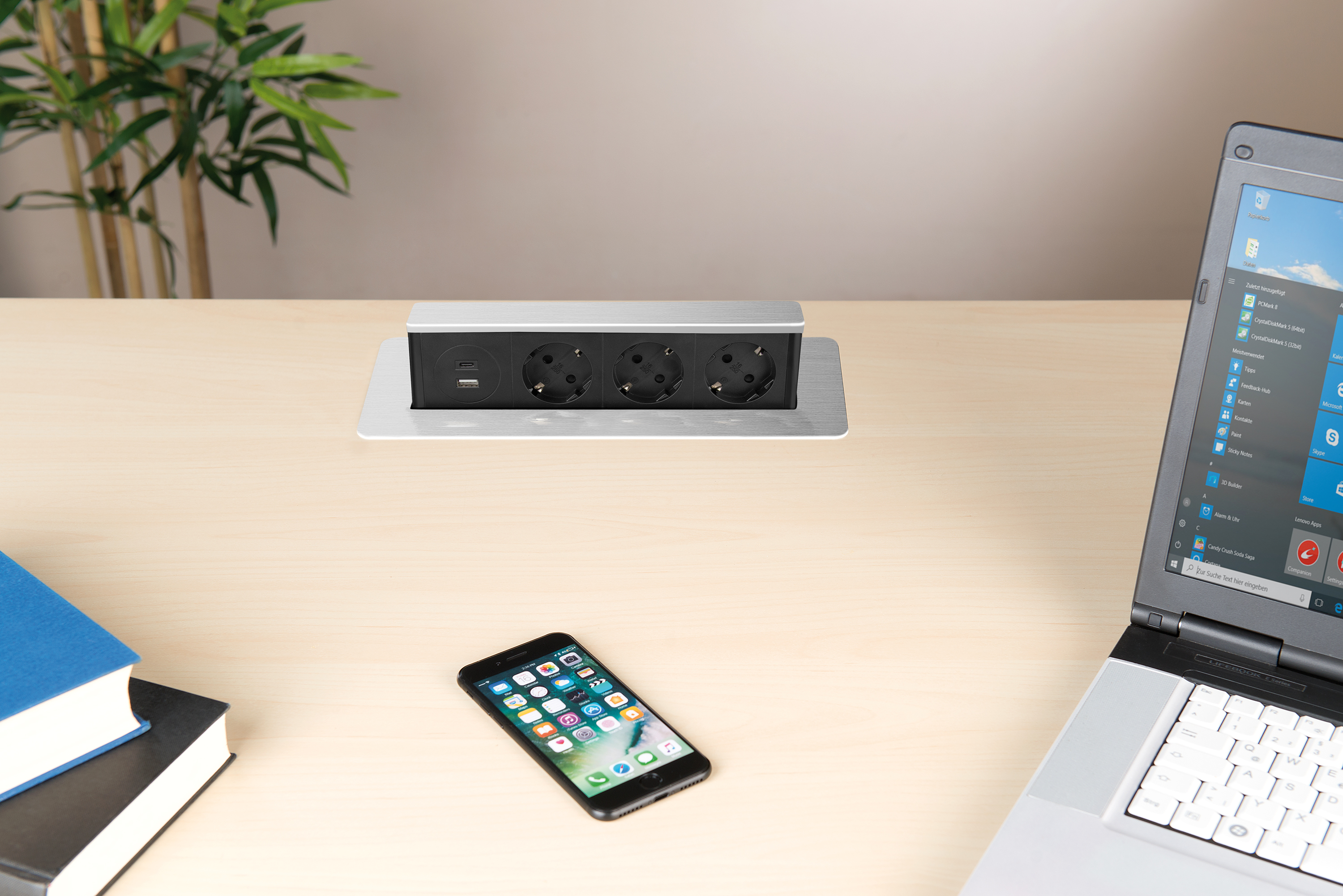 Die Ideale Steckdosenleiste für Büro, Küche und Heimwerkstatt: In Schreibtisch, Arbeitsplatte oder Werkbank eingelassen, nimmt die Leiste keinen Platz weg. Ein leichter Fingerdruck genügt: Schon fährt die 3-fach-Steckdosenleiste aus. Genauso leicht verschwindet sie auch wieder.