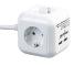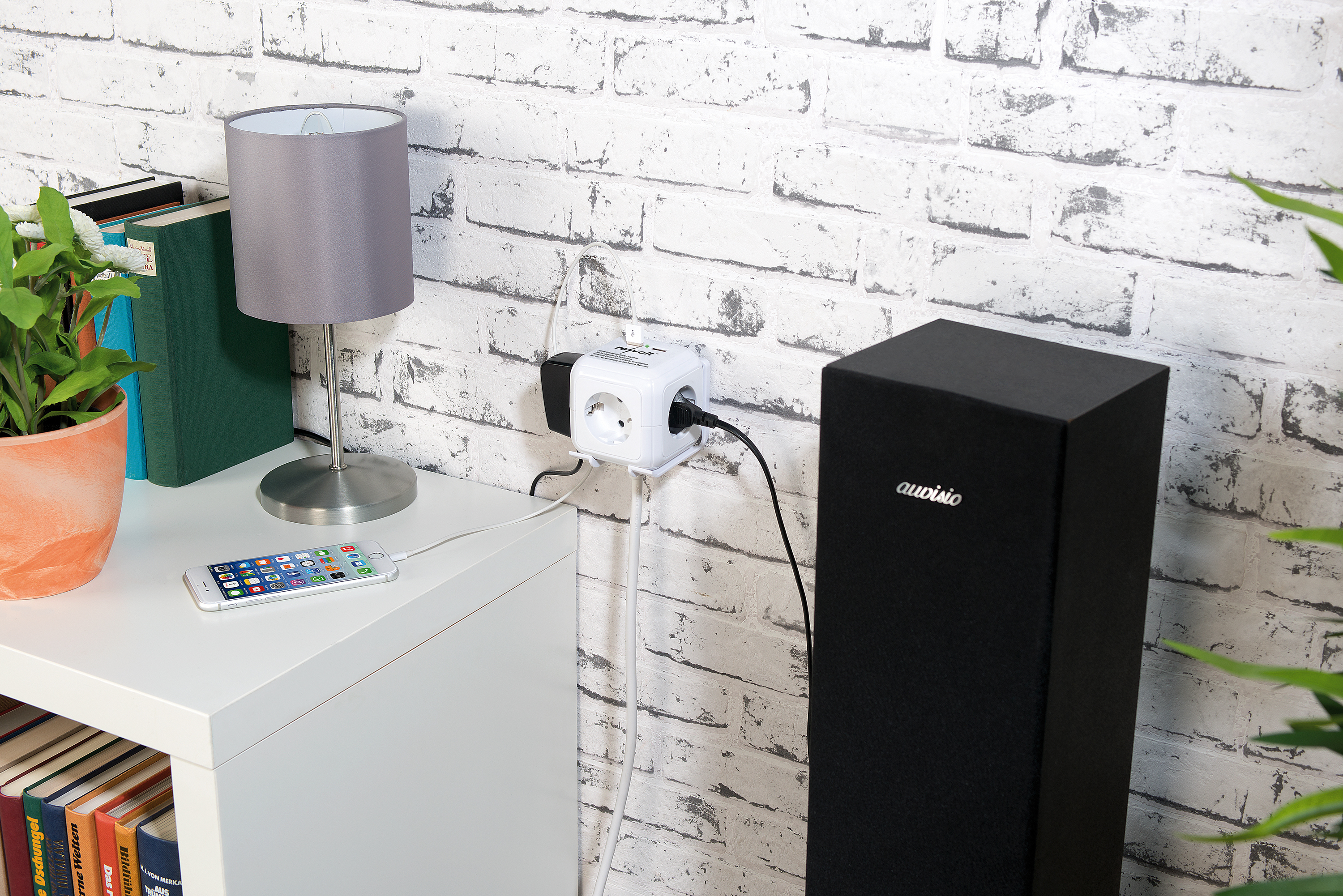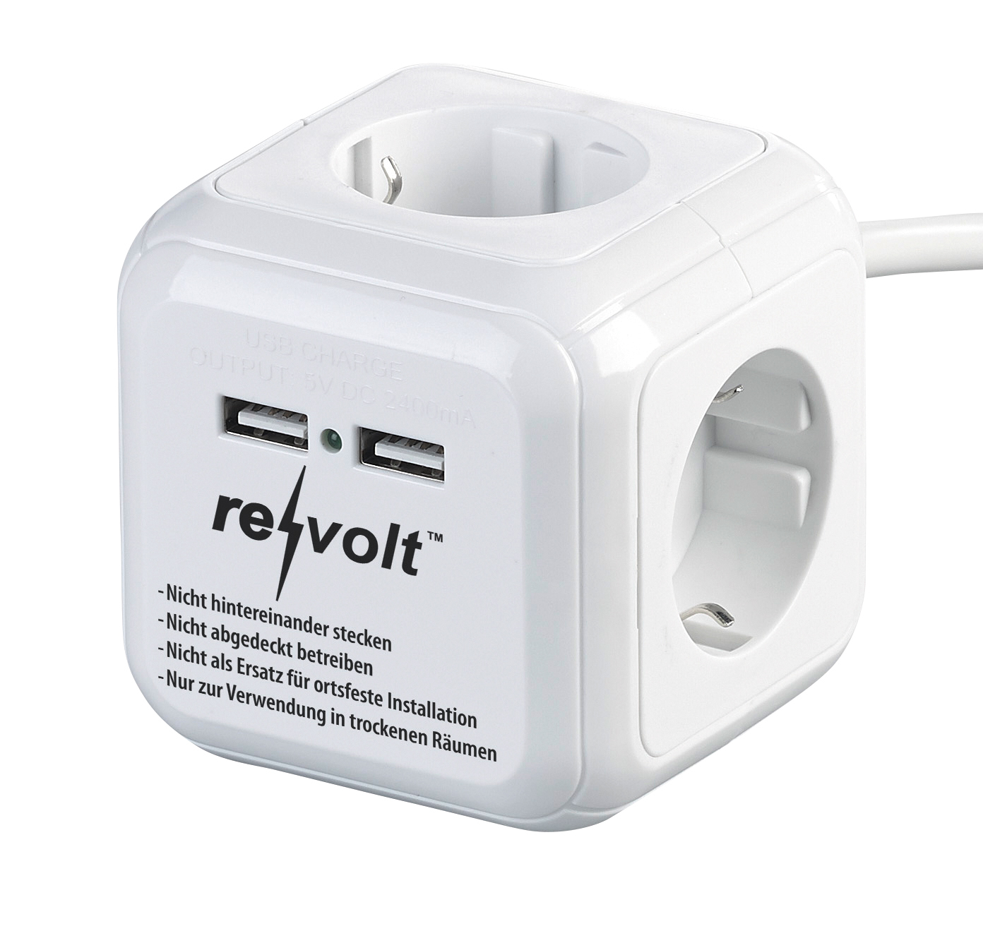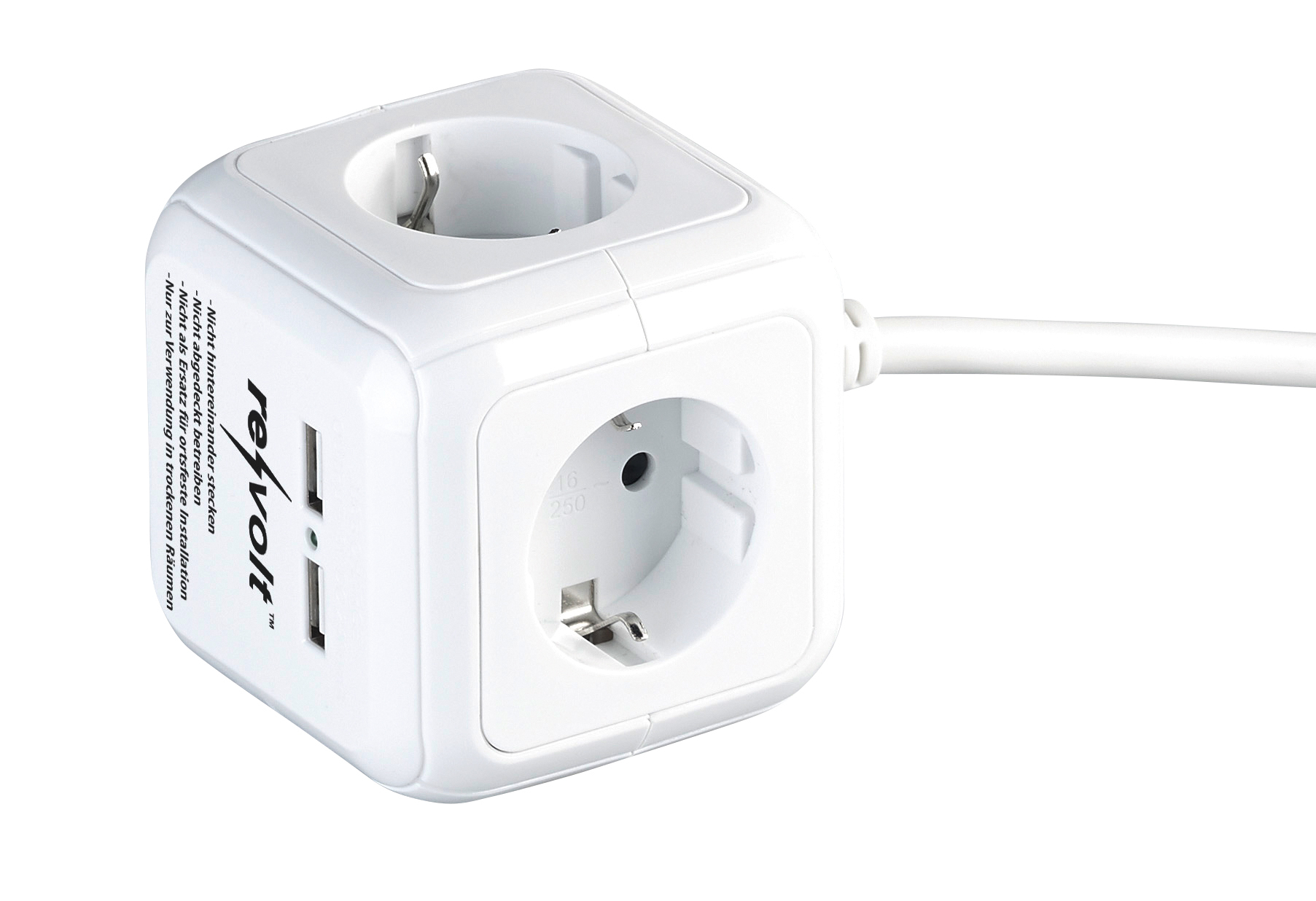Viele Anschlüsse auf kleinstem Raum: Mit dem cleveren Steckdosen-Würfel von revolt verzichtet man auf im Raum liegende Steckdosen-Leisten. So spart man viel Platz.