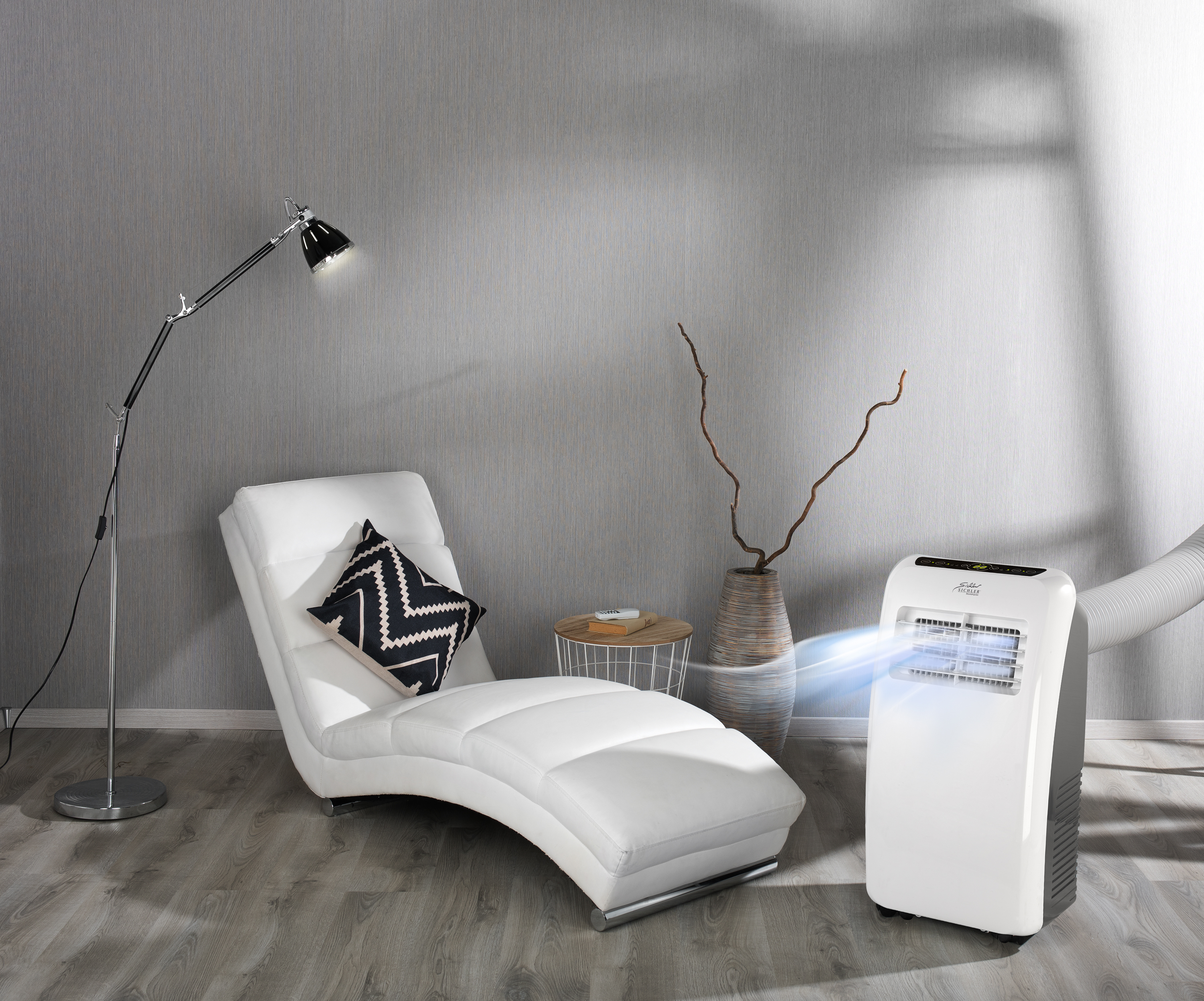 Der Mobil-Pluspunkt: Weil die Klimaanlage von Sichler Haushaltsgeräte auf Rollen steht, lässt sie sich auch schnell von Raum zu Raum schieben. So sorgt man tagsüber im Wohnzimmer für ein angenehmes Klima und nachts im Schlafzimmer.