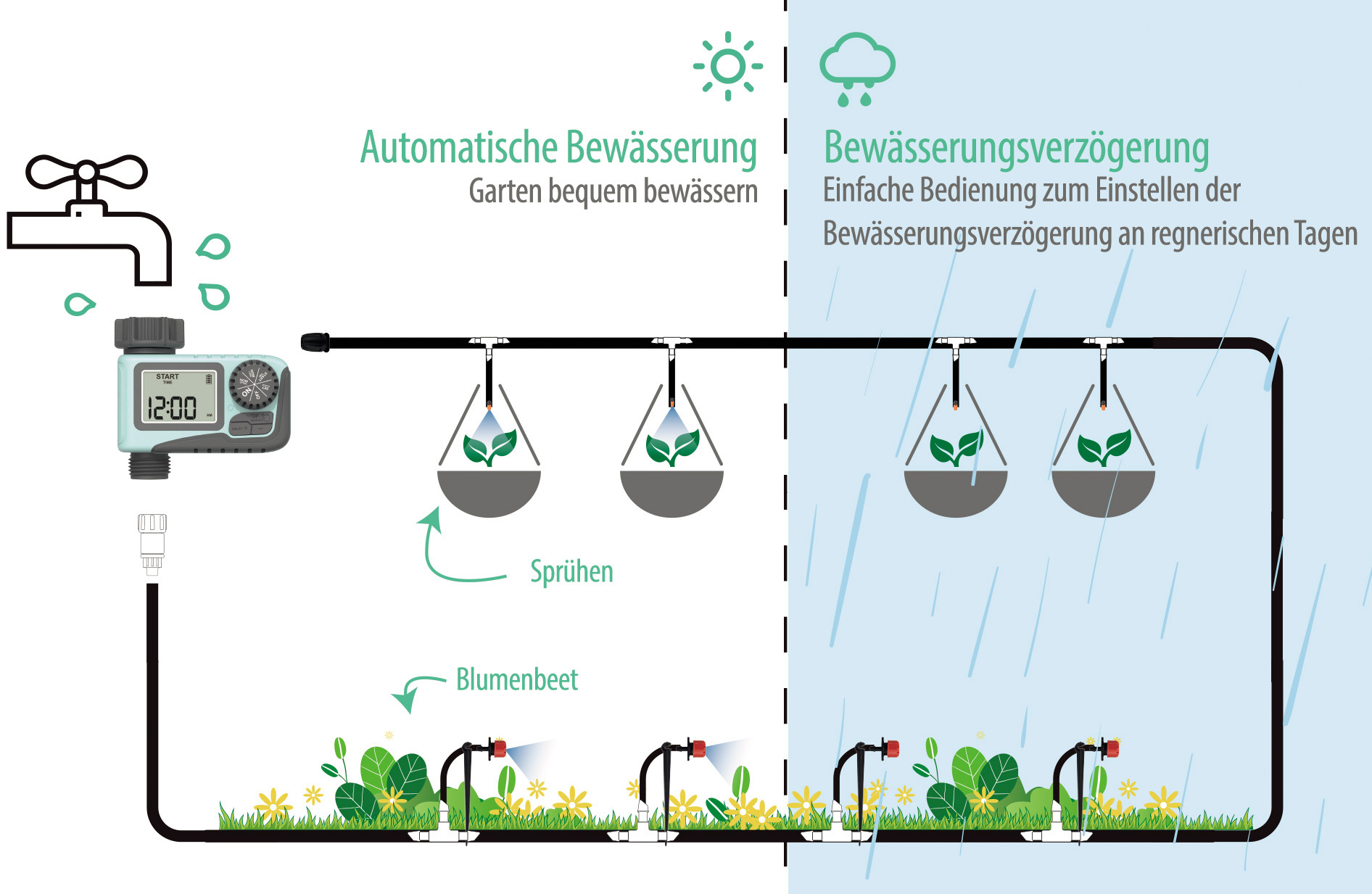 Tipps vom Profi-Gärtner: Die Bewässerungsuhr so programmieren, dass sie vor jedem Bewässerungsgang die Erde erst kurz angießt. Wird ein Sprinkler oder Sprühschlauch benutzt, dringt das Wasser tiefer ins Erdreich ein. Das kräftigt die Wurzeln!