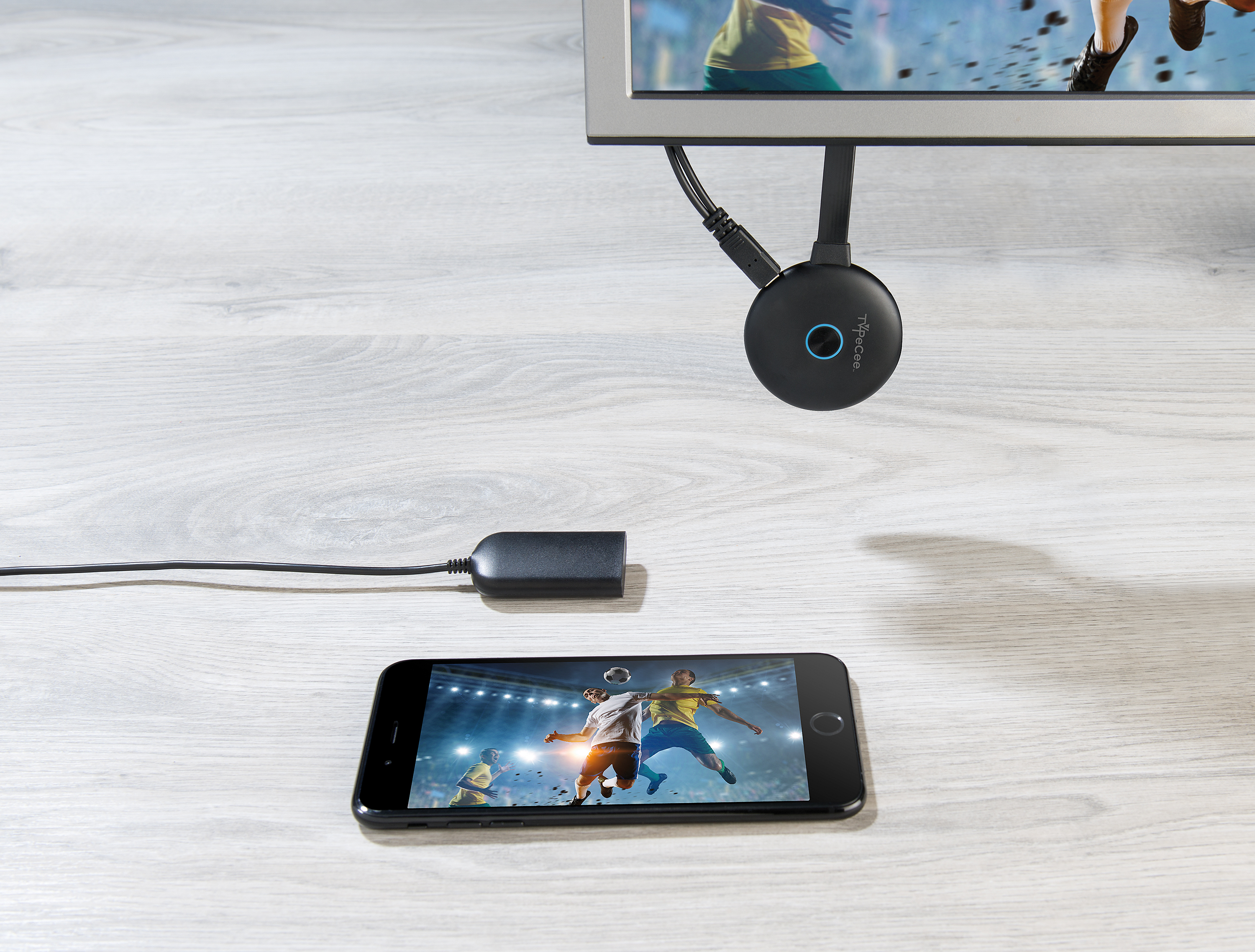 Kabelloses Streaming auf TV und Monitor leicht gemacht: Einfach den Streaming-Empfänger von TVPeCee in einen freien HDMI-Port einstecken und mit Strom versorgen. Schon bringt man mit wenigen Klicks auf dem Smartphone oder Tablet-PC Spiele, YouTube-Videos, Fotos und mehr groß raus!