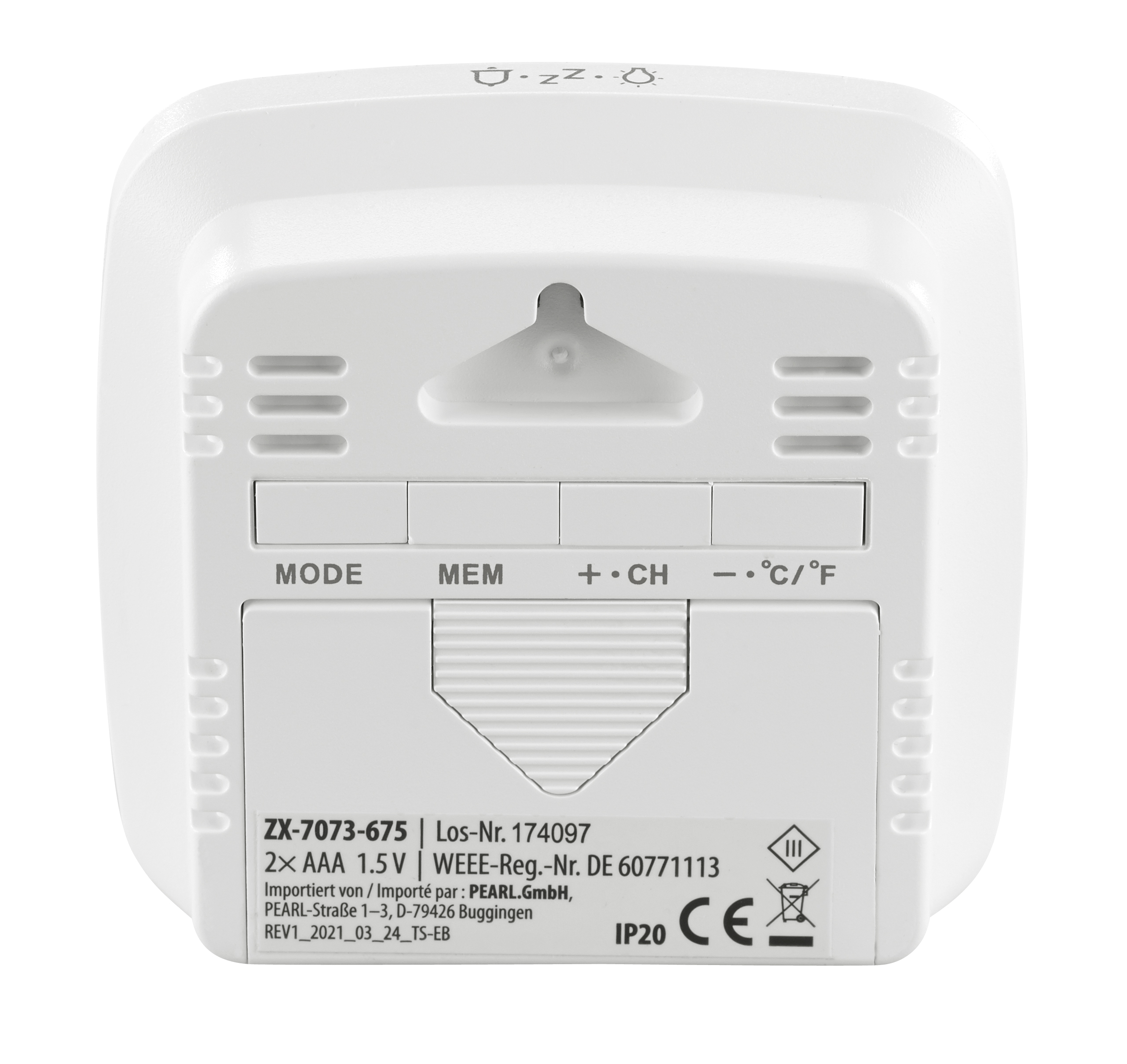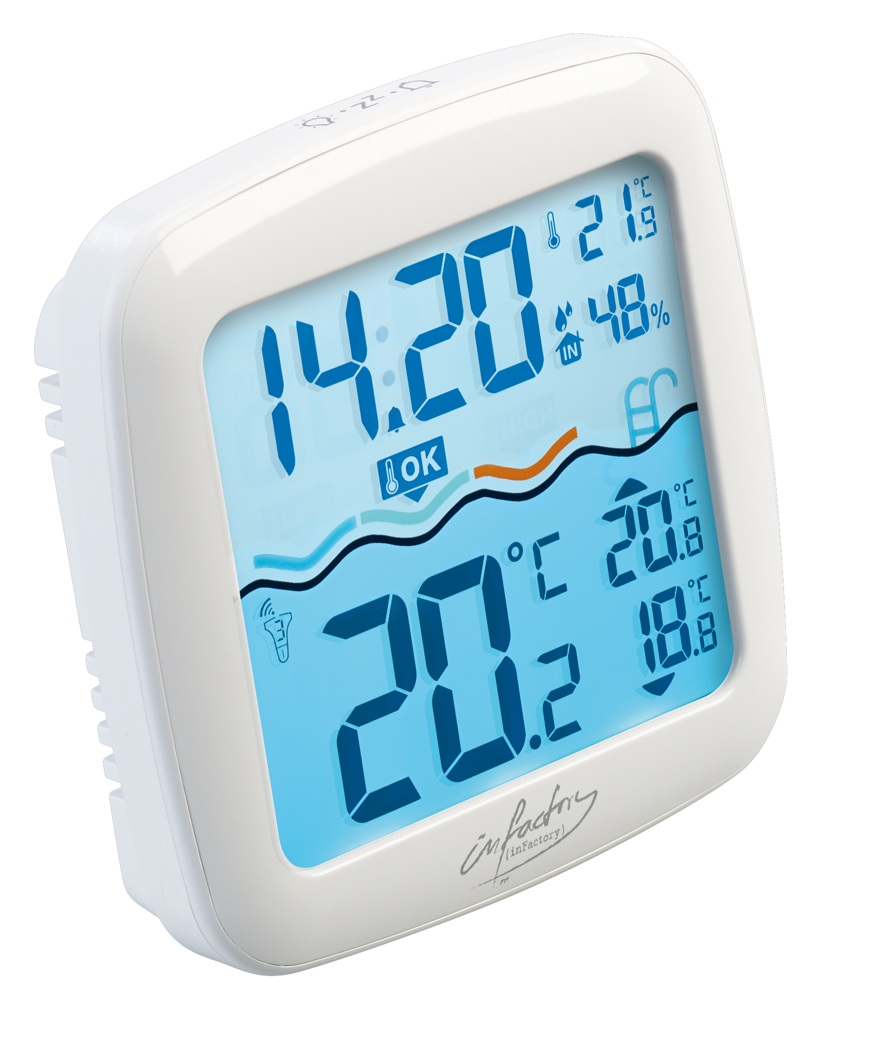 So behält man die Temperatur im Blick: Dank Funkverbindung liest man das Ergebnis auf dem übersichtlichen LCD-Farbdisplay der Empfänger-Einheit bequem im Wohnzimmer ab. Zusätzlich zeigt das Funk-Display die Raumtemperatur, die Luftfeuchtigkeit und die Uhrzeit an. Und bei Bedarf stellt man sich sogar einen Wecker!