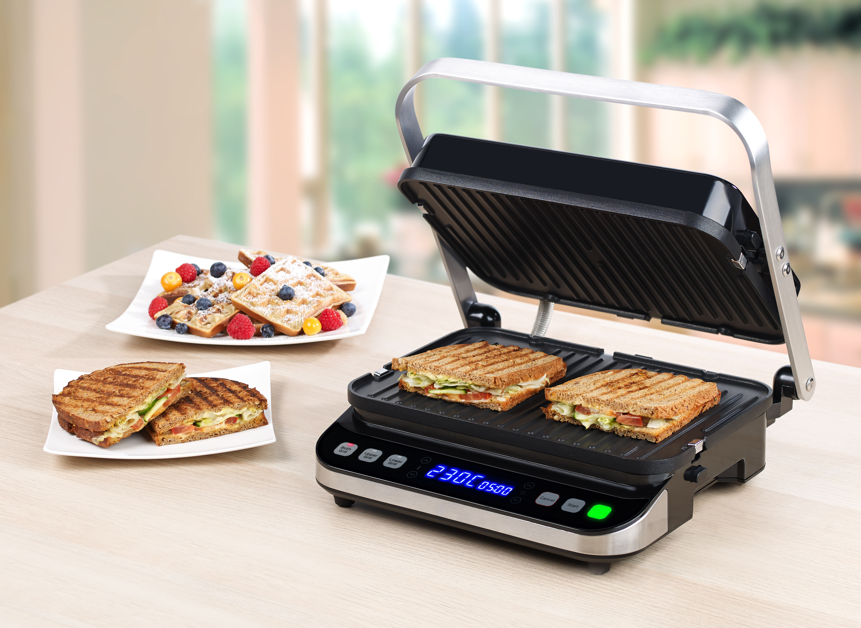 (lifepr) (Buggingen, 05.05.2022) Mit dem digitalen Panini-, Sandwich- & Kontaktgrill CG-2610 von Rosenstein & Söhnegrillt und toastet man besonders komfortabel, schonend und fettarm. Dank optionaler Waffeleisenplatten gelingen auch leckere Waffeln!