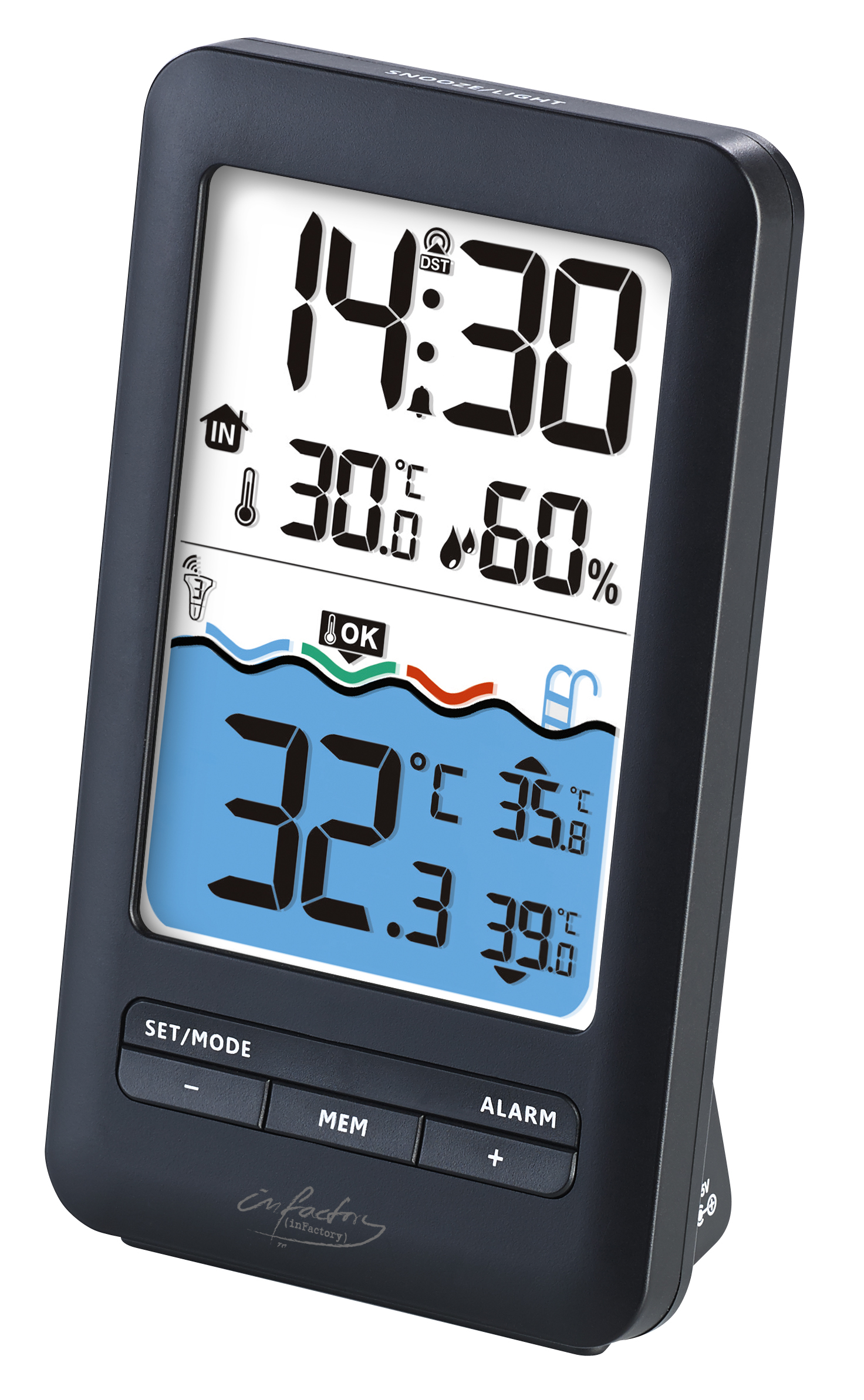 Für wohltemperiertes Wasser sorgen: Jetzt misst man einfach und komfortabel die Temperatur im Pool, Gartenteich oder auch in der Badewanne. Dank Funkverbindung liest man das Ergebnis auf dem übersichtlichen LCD-Farbdisplay der Empfänger-Einheit bequem im Wohnzimmer ab. Zusätzlich sieht man Raumtemperatur, Luftfeuchtigkeit und Minimal-/Maximal-Werte.