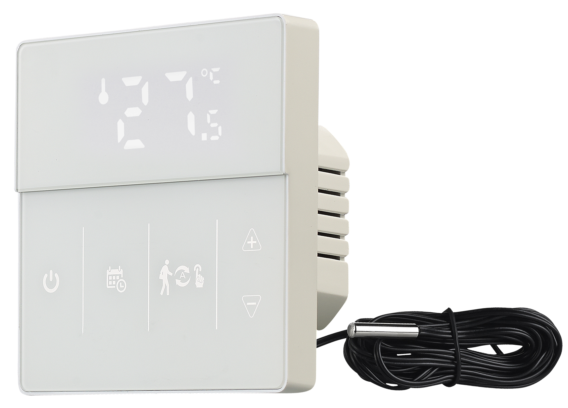 2 Temperatur-Fühler für präzise Messergebnisse: Ein Sensor ist im Gehäuse integriert, den zweiten, kabelgebundenen Sensor positioniert man am Boden. So misst das Thermostat sowohl die Raum- als auch die Boden-Temperatur und regelt die Wärme extra-präzise und auf ein halbes Grad genau! Alternativ kann man den externen Sensor auch an einer beliebigen Stelle in der Wohnung anbringen - ganz nach Bedarf.