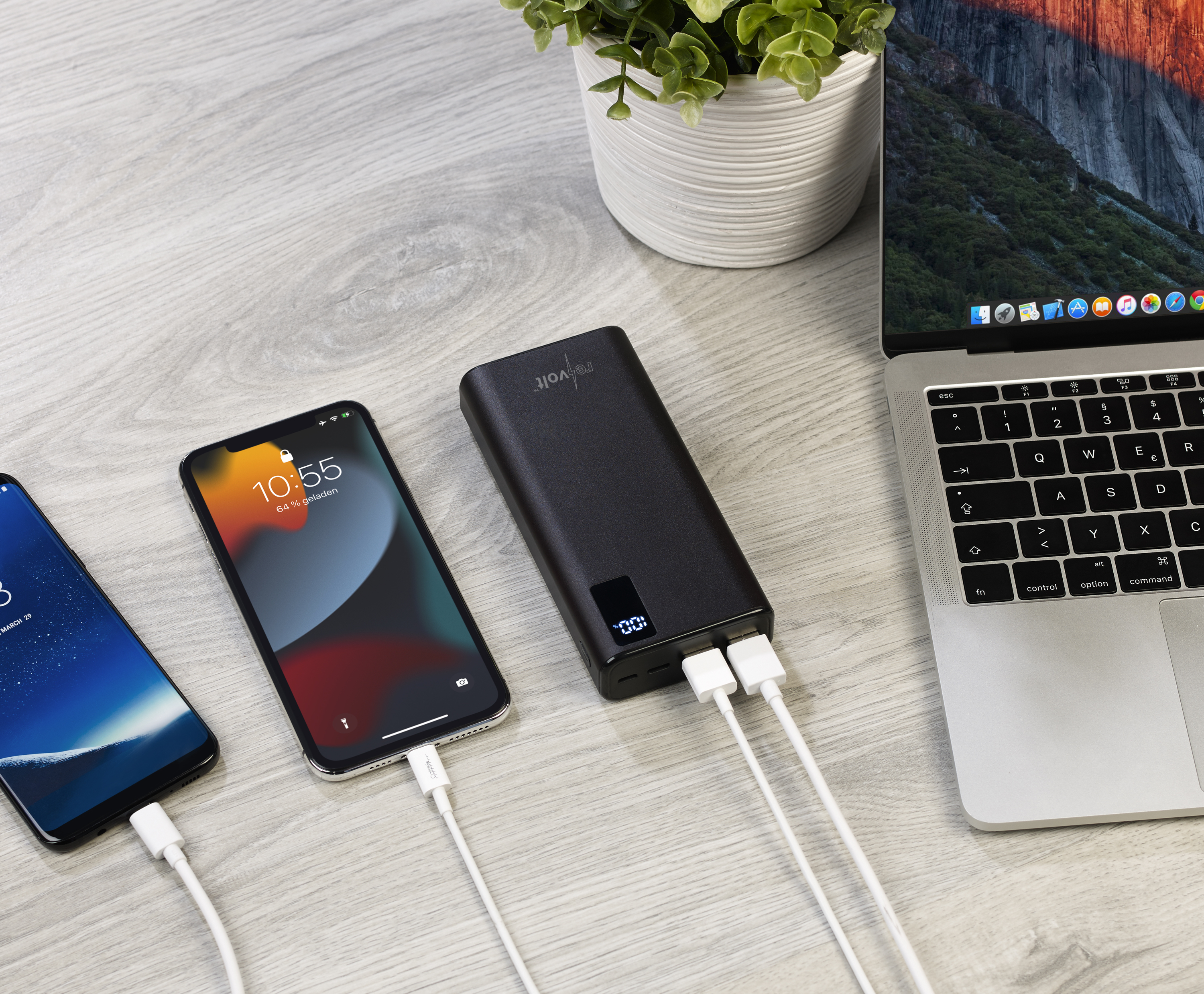 (lifepr) (Buggingen, 08.12.2022) Mit der USB-Powerbank PB-520.v2 von revolt lädt man unterwegs bis zu 3 Geräte gleichzeitig – dank Quick Charge und Power Delivery auch MacBooks! Der mobile Akku ist für alle Mobilgeräte geeignet, da sich der USB-Ladestrom dank ausgeklügelter Technologie automatisch dem jeweiligen Gerät anpasst.