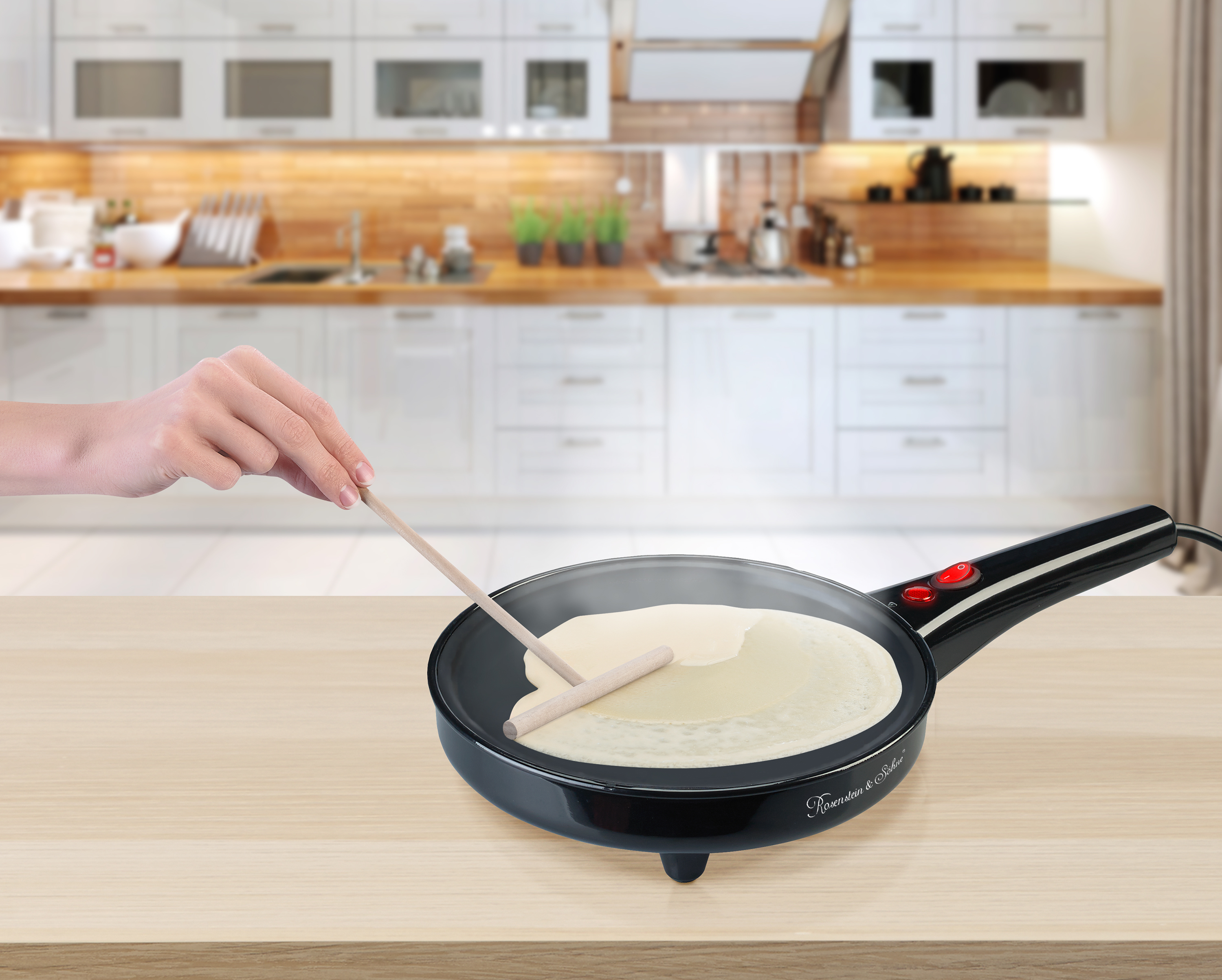 (lifepr) (Buggingen, 13.01.2023) Mit der 3in1-Crêpe-, Popcornmaker und elektrische Pfanne von Rosenstein & Söhne zaubert man Crêpes oder Popcorn und brät auch saftige Steaks – ein wahres Multitalent!