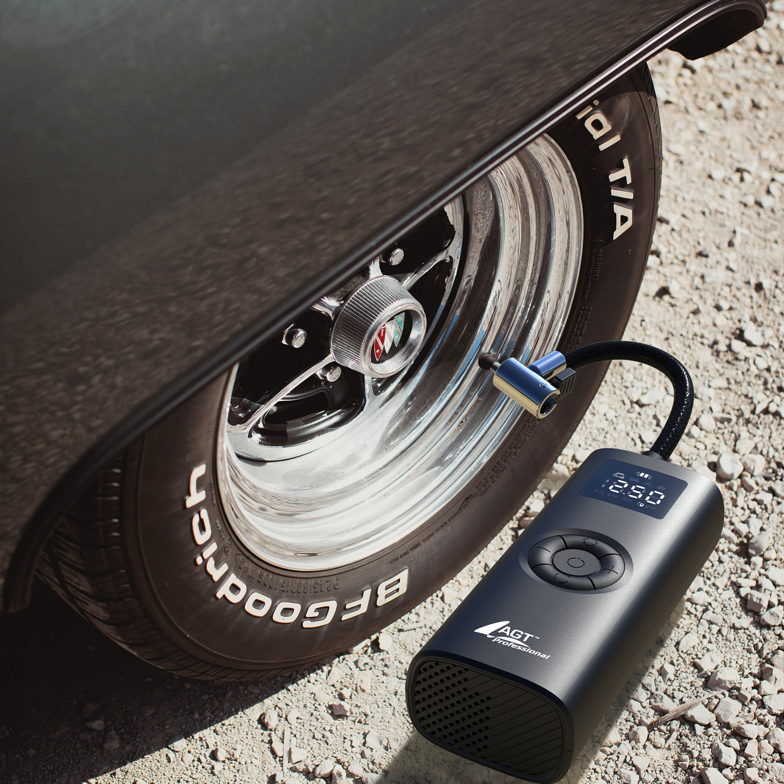 (lifepr) (Buggingen, 10.02.2023) Die ultrakompakte Akku-Kompressor-Luftpumpe ALP-155 von AGT Professional sorgt unterwegs immer für den richtigen Luftdruck bei Autos, Fahrrädern, Motorrädern, Bällen und Spielzeug, ohne eine Tankstelle anfahren zu müssen!