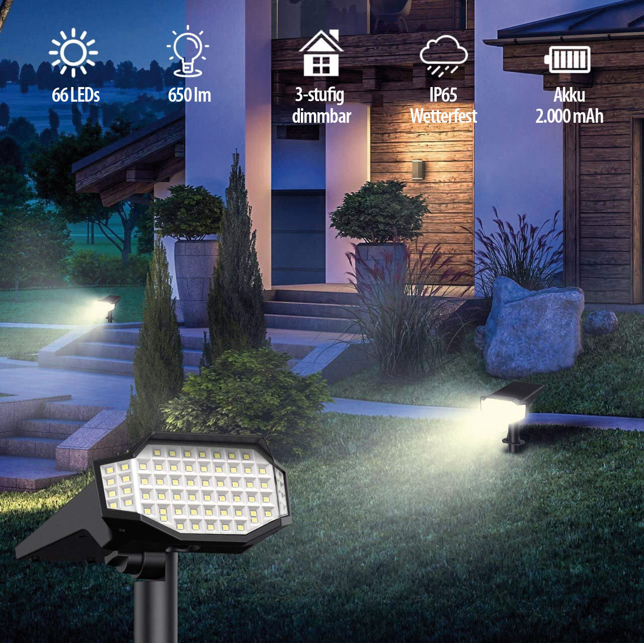 Kostengünstiges Licht ohne Kabelsalat: Dank Solarpanel laden sich die Gartenstrahler bei Tag von selbst auf. So ist man beim Aufstellen und Anbringen unabhängig von Steckdosen und Kabeln. Sobald es dunkel wird, spenden die je 66 LEDs warmweißes Licht mit bis zu starken 650 Lumen Helligkeit - ganz ohne eigenes Zutun!