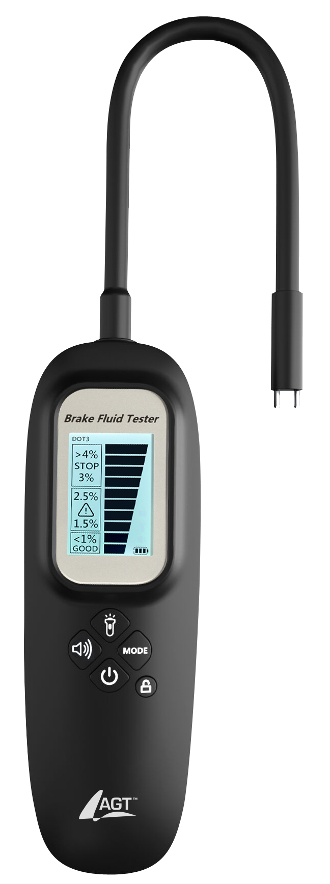 Die Sicherheit der Bremsen im Blick behalten: Enthält die Bremsflüssigkeit zu viel Wasser, wird der Bremsdruck nicht mehr richtig übertragen und die Bremsen versagen. Dank des Bremsflüssigkeits-Testers von AGT Professional überprüft man jetzt jederzeit selbst den Wasseranteil in der Bremsflüssigkeit. Zudem warnt ein Alarmton, wenn man neue Bremsflüssigkeit benötigt. So handelt man rechtzeitig und ist stets sicher unterwegs.