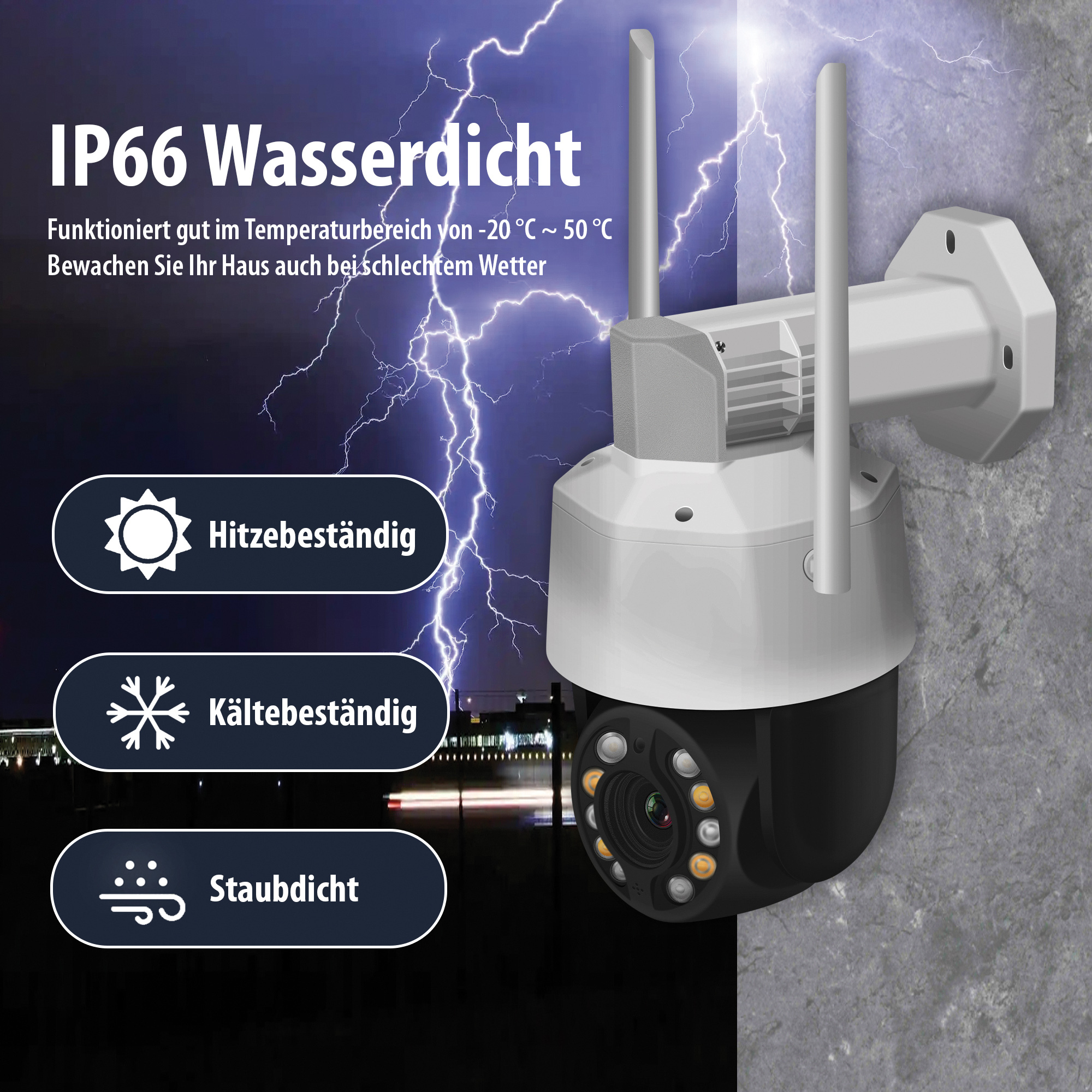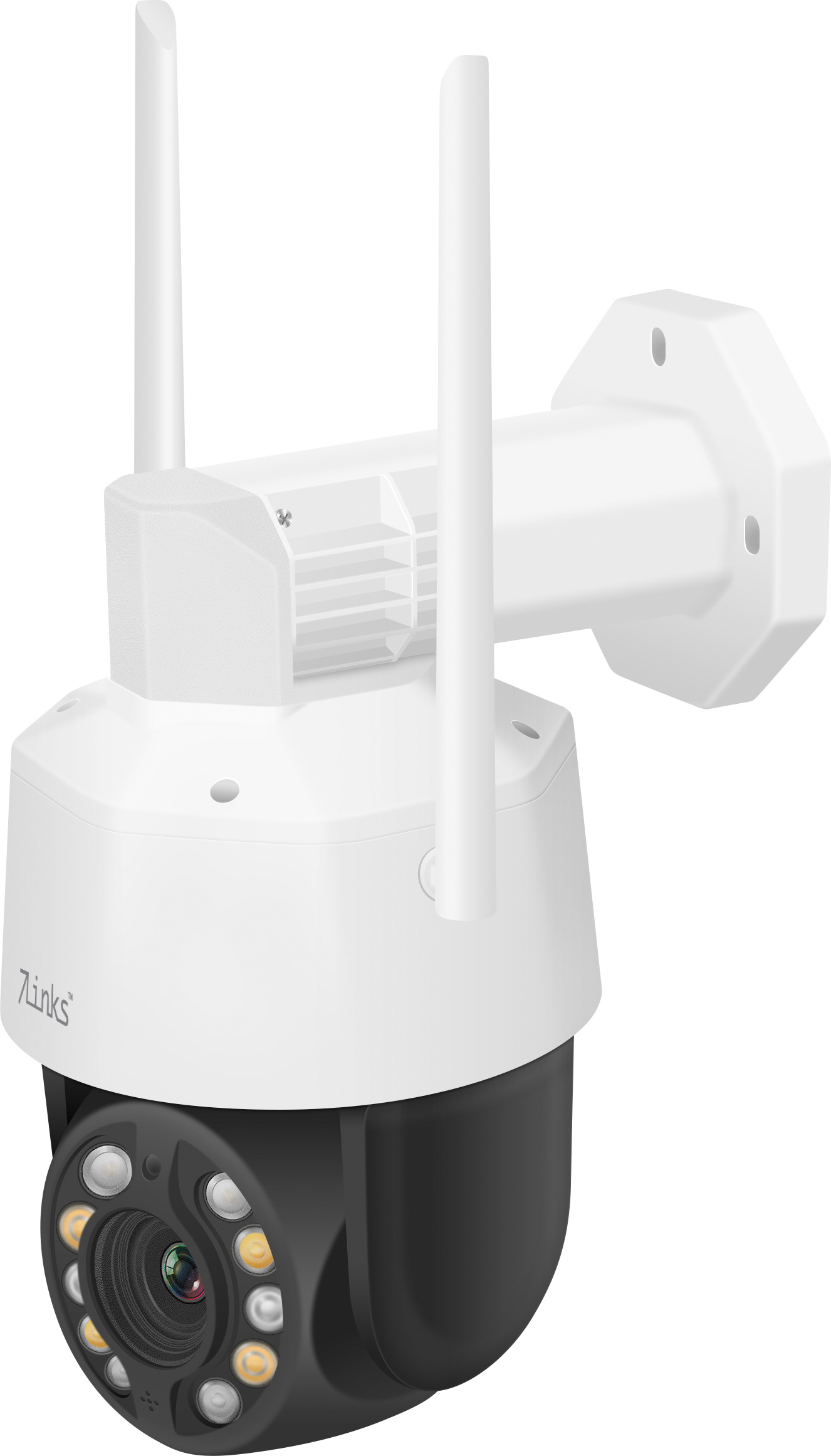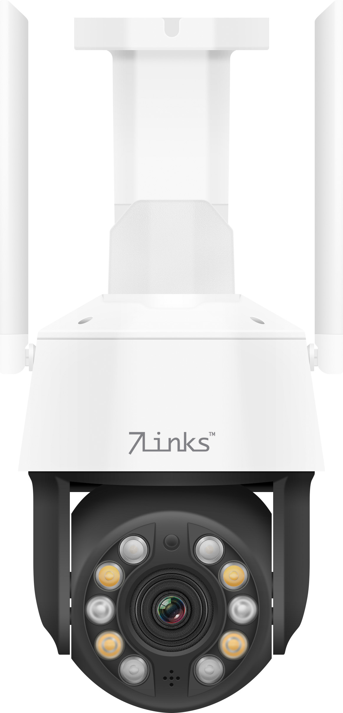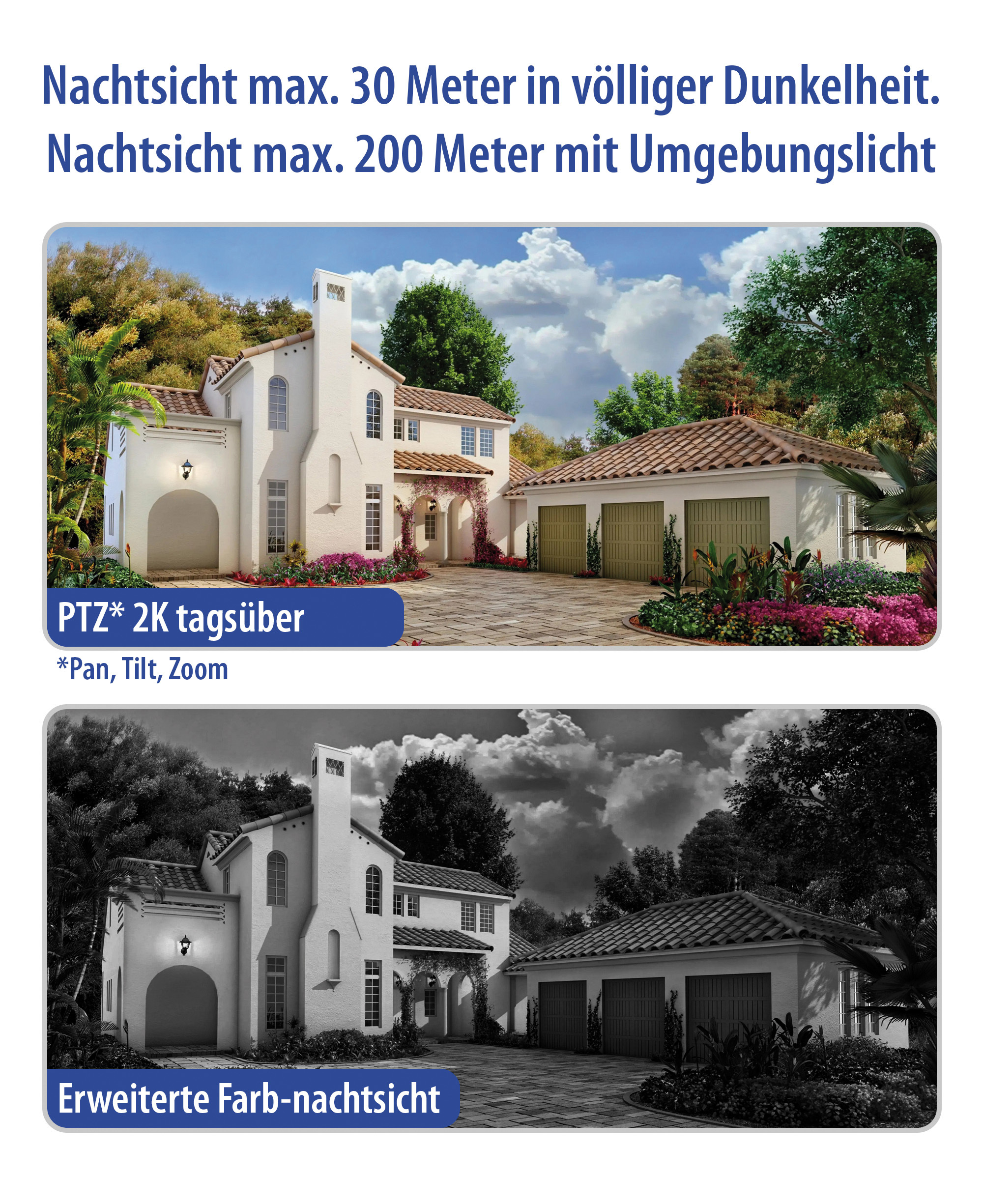 Nachtsicht in bis zu 100 Metern dank 4 Standard- und 2 gerichteten Laser-Infrarot-LEDs. Bei Dämmerung und Dunkelheit wird die Szene natürlich automatisch beleuchtet. Und möchte man auf kurze Distanz in Farbe sehen, was vor sich geht, schaltet man einfach die 4 weißen Licht-LEDs ein.