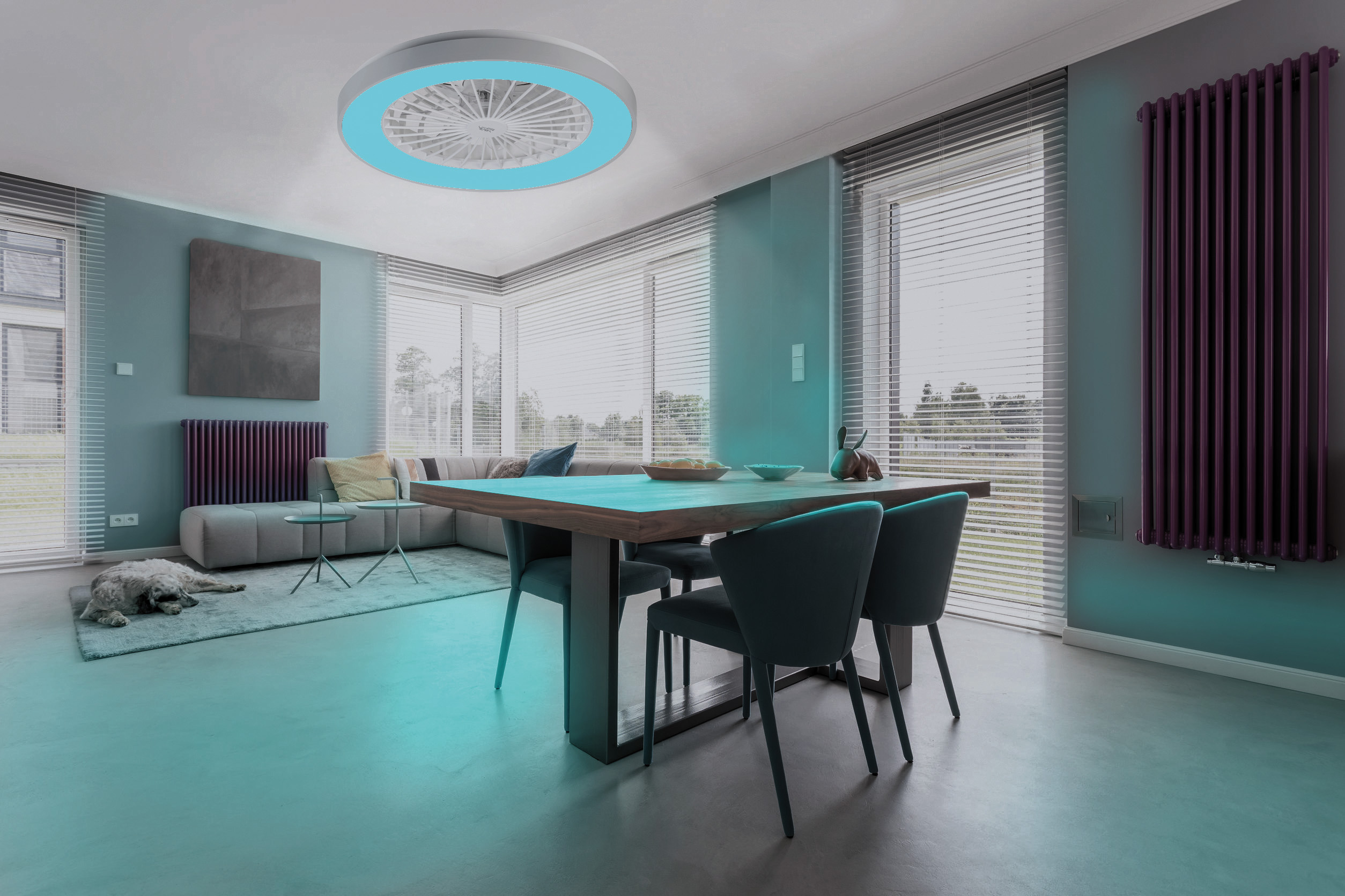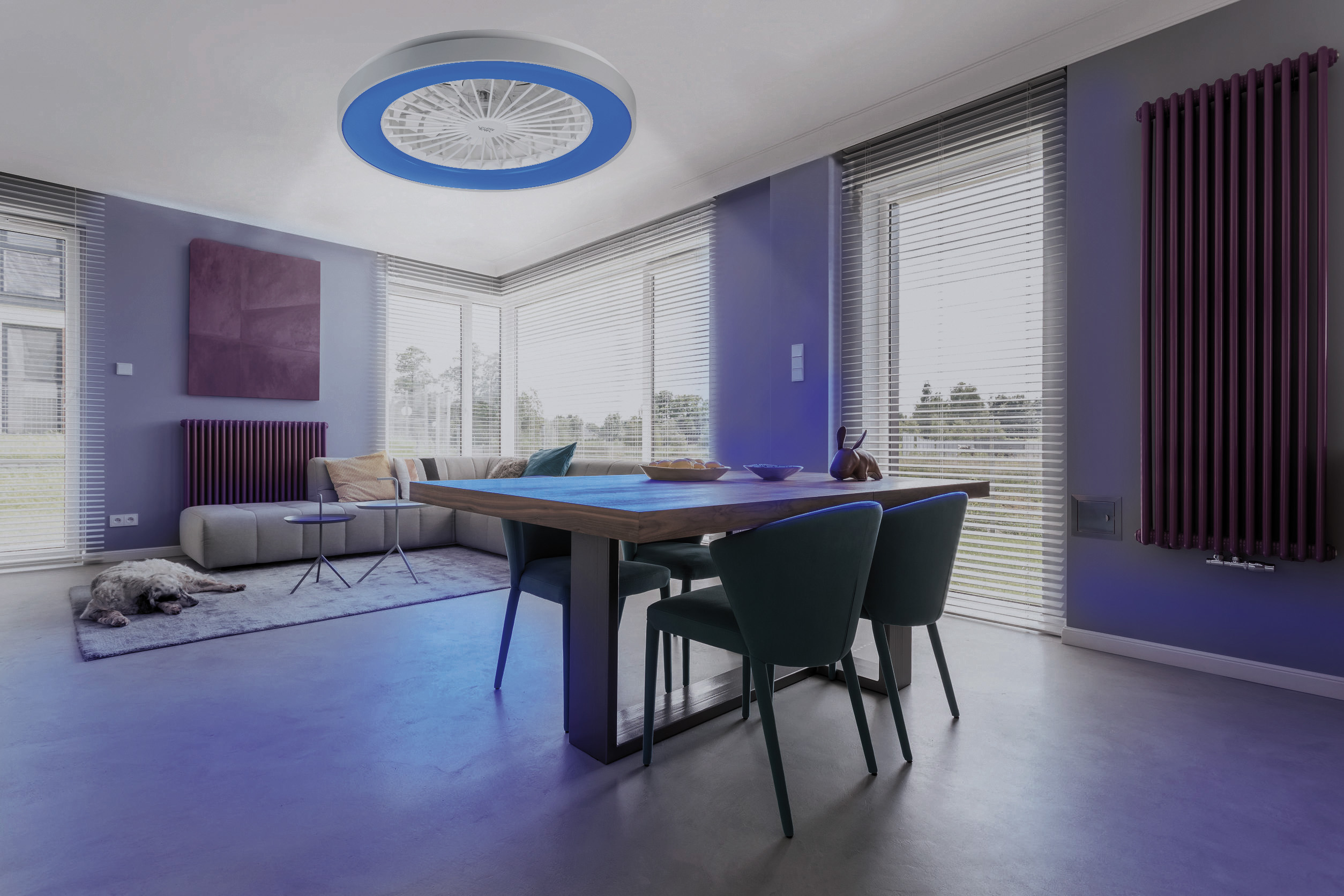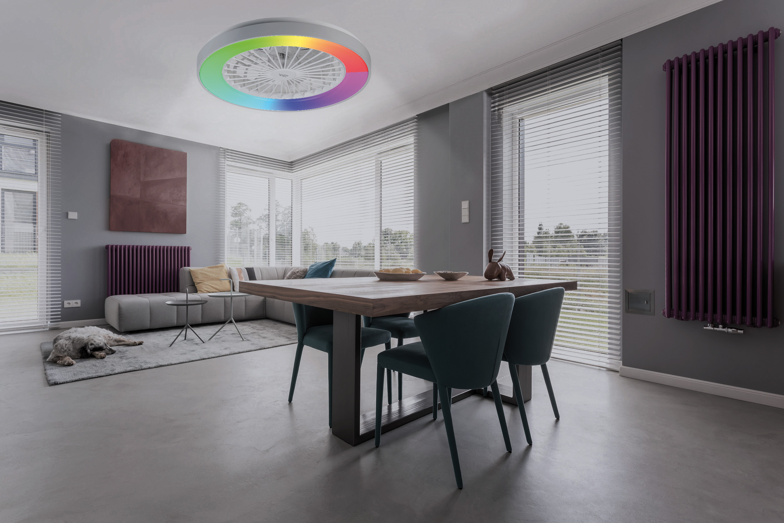 (lifepr) (Buggingen, 28.06.2023) Die 2in1-WLAN-Deckenleuchte & Ventilator VT-900.led von Sichler Haushaltsgeräte leuchtet in warmweiß, tageslichtweiß und 16 Millionen Farben und sorgt mit dem separat schaltbaren Ventilator für eine frische Brise. Die Steuerung erfolgt per Sprachbefehl, Fernbedienung oder kostenloser App „ELESION“.